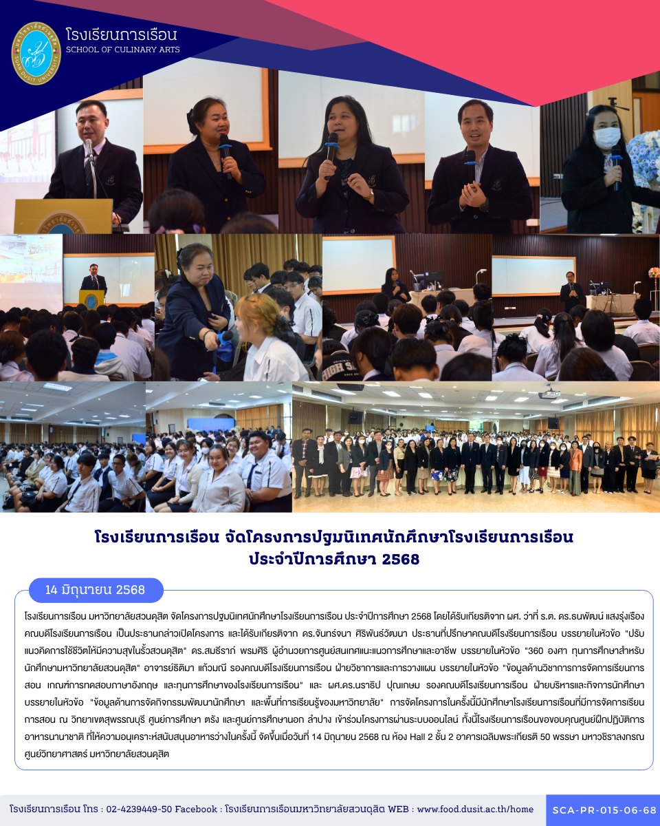 โรงเรียนการเรือน มหาวิทยาลัยสวนดุสิต จัดโครงการปฐมนิเทศนักศึกษาโรงเรียนการเรือน ประจำปีการศึกษา 2568 โดยได้รับเกียรติจาก ผศ. ว่าที่ ร.ต. ดร.ธนพัฒน์ แสงรุ่งเรือง คณบดีโรงเรียนการเรือน เป็นประธานกล่าวเปิดโครงการ และได้รับเกียรติจาก ดร.จันทร์จนา ศิริพันธ์วัฒนา ประธานที่ปรึกษาคณบดีโรงรียนการเรือน บรรยายในหัวข้อ "ปรับแนวคิดการใช้ชีวิตให้มีความสุขในรั้วสวนดุสิต" ดร.สมธีราภ์ พรมศิริ ผู้อำนวยการศูนย์สนเทศแนะแนวการศึกษาและอาชีพ บรรยายในหัวข้อ "360 องศา ทุนการศึกษาสำหรับนักศึกษามหาวิทยาลัยสวนดุสิต" อาจารย์ธิติมา แก้วมณี รองคณบดีโรงเรียนการเรือน ฝ่ายวิชาการและการวางแผน บรรยายในหัวข้อ "ข้อมูลด้านวิชาการการจัดการเรียนการสอน เกณฑ์การทดสอบภาษาอังกฤษ และทุนการศึกษาของโรงเรียนการเรือน" และ ผศ.ดร.นราธิป ปุณเกษม รองคณบดีโรงเรียนการเรือน ฝ่ายบริหารและกิจการนักศึกษา บรรยายในหัวข้อ "ข้อมูลด้านการจัดกิจกรรมพัฒนานักศึกษา และพื้นที่การเรียนรู้ของมหาวิทยาลัย" การจัดโครงการในครั้งนี้มีนักศึกษาโรงเรียนการเรือนที่มีการจัดการเรียนการสอน ณ วิทยาเขตสุพรรณบุรี ศูนย์การศึกษา ตรัง และศูนย์การศึกษานอก ลำปาง เข้าร่วมโครงการผ่านระบบออนไลน์ ทั้งนี้โรงเรียนการเรือนขอขอบคุณศูนย์ฝึกปฏิบัติการอาหารนานาชาติ ที่ให้ความอนุเคราะห์สนับสนุนอาหารว่างในครั้งนี้ จัดขึ้นเมื่อวันที่ 14 มิถุนายน 2568 ณ ห้อง Hall 2 ชั้น 2 อาคารเฉลิมพระเกียรติ 50 พรรษา มหาวชิราลงกรณ ศูนย์วิทยาศาสตร์ มหาวิทยาลัยสวนดุสิต