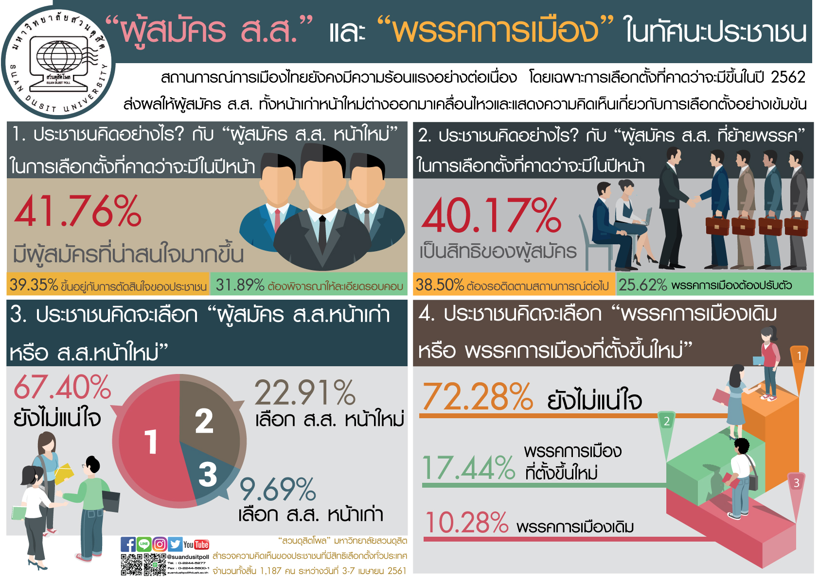 ผลการสำรวจความคิดเห็นของประชาชนที่มีสิทธิเลือกตั้งทั่วประเทศจำนวน 1,187 คน จัดทำโดย "สวนดุสิตโพล" มหาวิทยาลัยสวนดุสิต ระหว่างวันที่ 3-7 เมษายน 2561 เกี่ยวกับทัศนคติต่อผู้สมัคร ส.ส. และพรรคการเมืองในบริบทการเลือกตั้งที่คาดว่าจะมีขึ้นในปี 2562 การสำรวจแบ่งเป็น 4 ประเด็นหลัก ได้แก่ (1) ความคิดเห็นต่อผู้สมัคร ส.ส. หน้าใหม่ ซึ่งประชาชนส่วนใหญ่เห็นว่ามีความหลากหลายและน่าสนใจมากขึ้น (2) ความคิดเห็นต่อผู้สมัคร ส.ส. ที่ย้ายพรรค โดยมองว่าเป็นสิทธิของผู้สมัครที่สามารถทำได้ (3) การตัดสินใจเลือกระหว่างผู้สมัคร ส.ส. หน้าเก่าหรือหน้าใหม่ พบว่าร้อยละ 67.40 ยังไม่แน่ใจ ร้อยละ 22.91 เลือก ส.ส. หน้าใหม่ และร้อยละ 9.69 เลือก ส.ส. หน้าเก่า และ (4) การตัดสินใจเลือกระหว่างพรรคการเมืองเดิมหรือพรรคการเมืองใหม่ พบว่าร้อยละ 72.28 ยังไม่แน่ใจ ร้อยละ 17.44 เลือกพรรคการเมืองใหม่ และร้อยละ 10.28 เลือกพรรคการเมืองเดิม ทั้งนี้ ผลสำรวจสะท้อนว่าประชาชนส่วนใหญ่ยังต้องการข้อมูลเพิ่มเติมก่อนตัดสินใจเลือกผู้สมัครและพรรคการเมือง