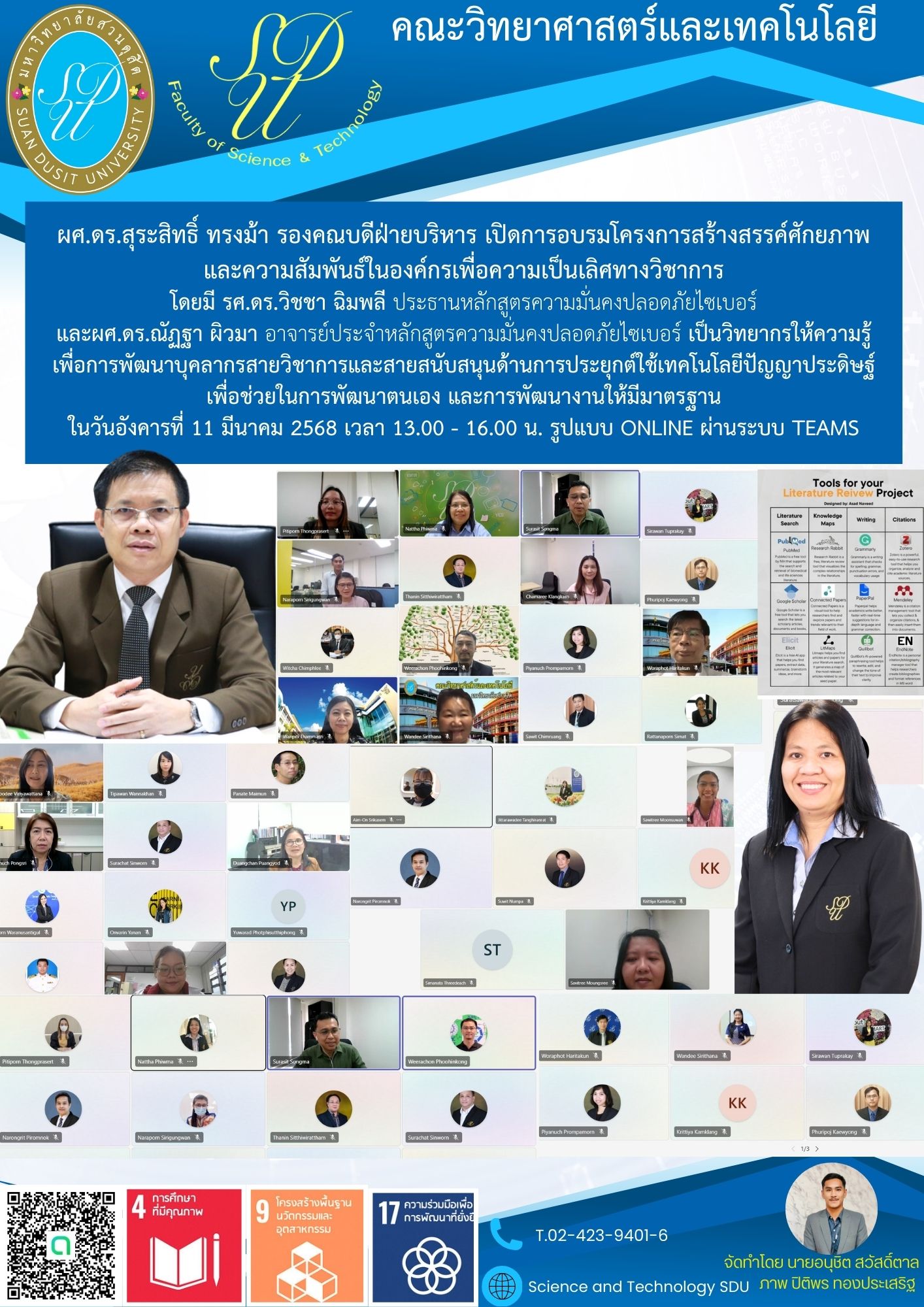 ผศ.ดร.สุระสิทธิ์ ทรงม้า รองคณบดีฝ่ายบริหาร เปิดการอบรมโครงการสร้างสรรค์ศักยภาพ และความสัมพันธ์ในองค์กรเพื่อความเป็นเลิศทางวิชาการ โดยมี รศ.ดร.วิชชา ฉิมพลี ประธานหลักสูตรความมั่นคงปลอดภัยไซเบอร์ และผศ.ดร.ณัฏฐา ผิวมา อาจารย์ประจำหลักสูตรความมั่นคงปลอดภัยไซเบอร์ เป็นวิทยากรให้ความรู้ เพื่อการพัฒนาบุคลากรสายวิชาการและสายสนับสนุนด้านการประยุกต์ใช้เทคโนโลยีปัญญาประดิษฐ์ เพื่อช่วยในการพัฒนาตนเอง และการพัฒนางานให้มีมาตรฐาน ในวันอังคารที่ 11 มีนาคม 2568 เวลา 13.00 - 16.00 น. รูปแบบ Online ผ่านระบบ Teams
