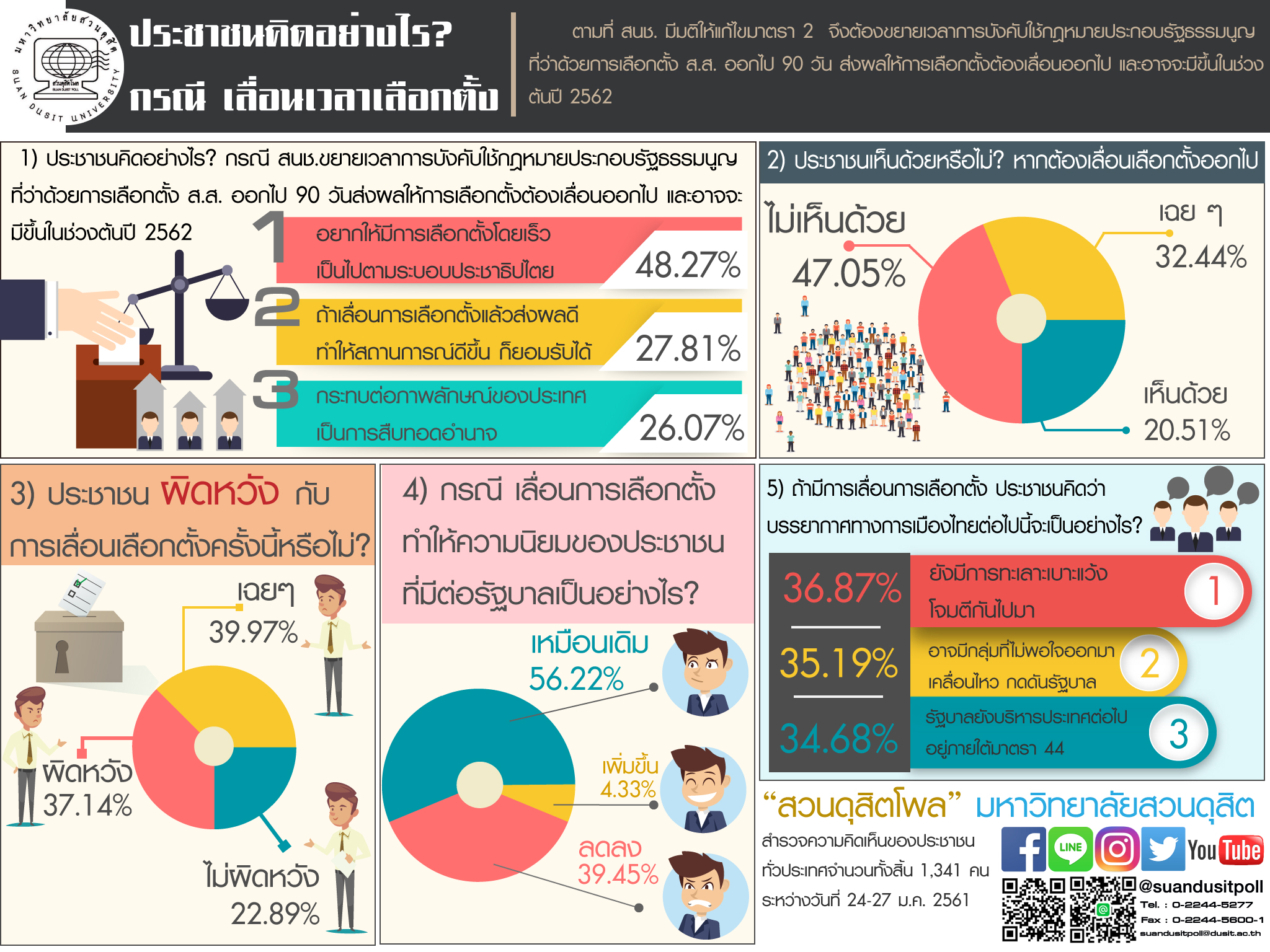 จากกรณีสภานิติบัญญัติแห่งชาติ (สนช.) มีมติขยายเวลาบังคับใช้กฎหมายเลือกตั้งสมาชิกสภาผู้แทนราษฎรออกไป 90 วัน ส่งผลให้การเลือกตั้งต้องเลื่อนออกไปเป็นช่วงต้นปี 2562 “สวนดุสิตโพล” ได้สำรวจความคิดเห็นของประชาชนทั่วประเทศจำนวน 1,341 คน ระหว่างวันที่ 24-27 มกราคม 2561 ผลสำรวจพบว่า ประชาชนส่วนใหญ่ (48.27%) ต้องการให้มีการเลือกตั้งโดยเร็ว เพื่อให้เป็นไปตามระบอบประชาธิปไตย ในขณะที่บางส่วน (27.81%) ยอมรับได้หากการเลื่อนมีผลดีต่อสถานการณ์ และมีผู้มองว่าเป็นการสืบทอดอำนาจ (26.07%) ส่วนใหญ่ไม่เห็นด้วยกับการเลื่อนเลือกตั้ง (47.05%) และมีความผิดหวังระดับหนึ่ง (37.14%) โดยผลต่อความนิยมรัฐบาล พบว่าประชาชนส่วนใหญ่มองว่า “ยังคงเหมือนเดิม” (56.22%) แต่ก็มีบางส่วนที่ลดความนิยมลง (39.45%) สะท้อนความไม่เชื่อมั่นต่อรัฐบาล สำหรับบรรยากาศทางการเมืองคาดว่าจะยังคงเต็มไปด้วยความขัดแย้ง ความเคลื่อนไหวของกลุ่มต่าง ๆ และการใช้มาตรา 44 ต่อเนื่อง