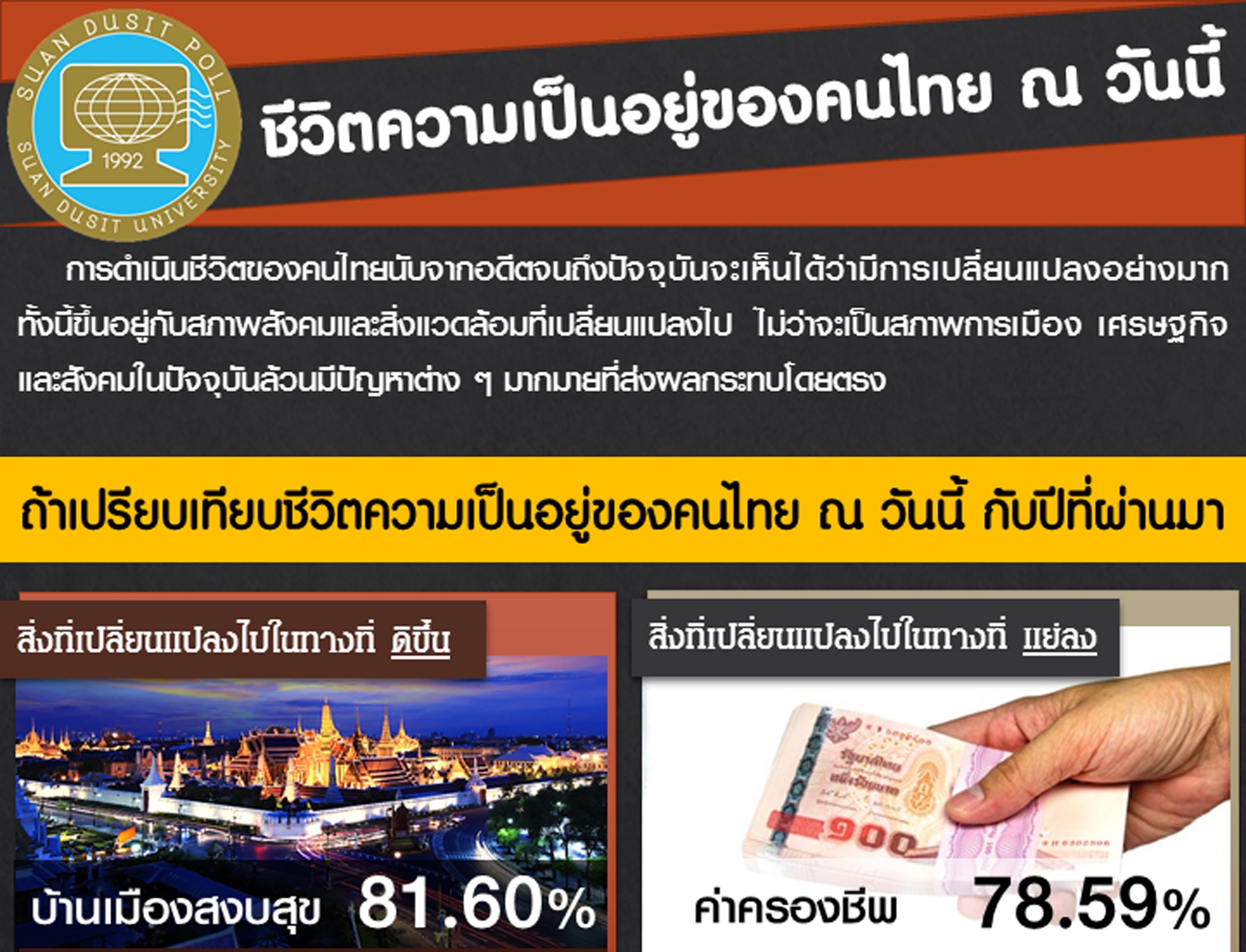 จากการเปลี่ยนแปลงของสภาพสังคม เศรษฐกิจ และสิ่งแวดล้อมในปัจจุบัน “สวนดุสิตโพล” ได้สำรวจความคิดเห็นของประชาชนทั่วประเทศจำนวน 1,359 คน ระหว่างวันที่ 28 พฤศจิกายน – 2 ธันวาคม 2559 เพื่อสะท้อนภาพรวมชีวิตความเป็นอยู่ของประชาชน พบว่า สิ่งที่ดีขึ้นคือความสงบสุขของบ้านเมือง ความสามัคคีของคนไทย และพัฒนาการด้านคมนาคมและเทคโนโลยี อย่างไรก็ตาม ประชาชนยังมองว่าปัญหาค่าครองชีพสูง การจราจรติดขัด สิ่งแวดล้อมเสื่อมโทรม และความเดือดร้อนของเกษตรกรเป็นเรื่องที่แย่ลง ขณะที่ประเด็นที่ยังไม่เปลี่ยนแปลง ได้แก่ สภาพเศรษฐกิจ ความเหลื่อมล้ำ ยาเสพติด และรายได้ที่ไม่เพียงพอกับรายจ่าย เพื่อให้ชีวิตความเป็นอยู่ดีขึ้น ประชาชนเสนอแนวทาง ได้แก่ การดำเนินชีวิตอย่างพอเพียง มีวินัยทางการเงิน ความร่วมมือในสังคม และการที่รัฐบาลต้องเร่งแก้ปัญหาเศรษฐกิจและลดค่าครองชีพอย่างจริงจัง