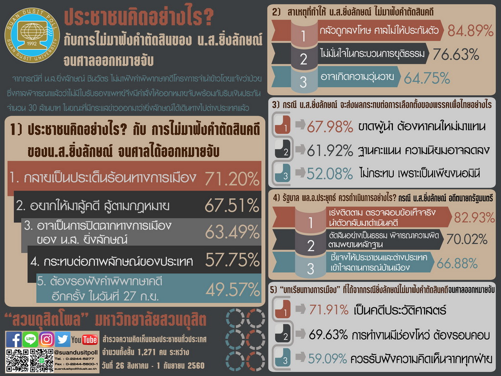 การสำรวจความคิดเห็นของประชาชนจำนวน 1,271 คน ระหว่างวันที่ 26 สิงหาคม - 1 กันยายน 2560 เกี่ยวกับกรณีที่ น.ส.ยิ่งลักษณ์ ชินวัตร ไม่มาฟังคำพิพากษาคดีโครงการจำนำข้าว จนศาลออกหมายจับและริบเงินประกัน 30 ล้านบาท