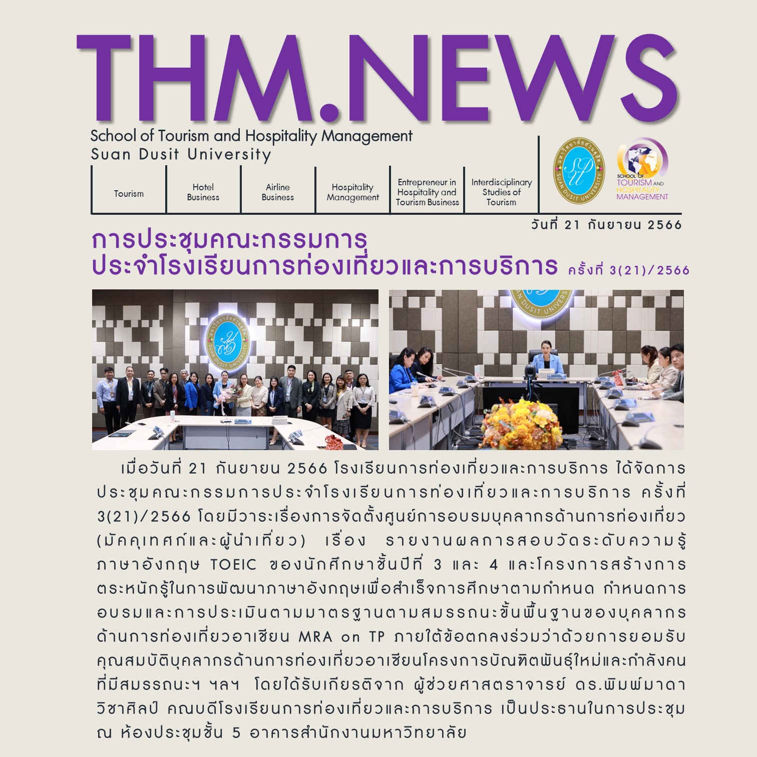 เมื่อวันที่ 21 กันยายน 2566 โรงเรียนการท่องเที่ยวและการบริการ ได้จัดการประชุมคณะกรรมการประจำโรงเรียนการท่องเที่ยวและการบริการ ครั้งที่ 3(21)/2566 โดยมีวาระเรื่องการจัดตั้งศูนย์การอบรมบุคลากรด้านการท่องเที่ยว (มัคคุเทศก์และผู้นำเที่ยว) เรื่อง รายงานผลการสอบวัดระดับความรู้ภาษาอังกฤษ TOEIC ของนักศึกษาชั้นปีที่ 3 และ 4 และโครงการสร้างการ ตระหนักรู้ในการพัฒนาภาษาอังกฤษเพื่อสำเร็จการศึกษาตามกำหนด กำหนดการอบรมและการประเมินตามมาตรฐานตามสมรรถนะขั้นพื้นฐานของบุคลากรด้านการท่องเที่ยวอาเชียน MRA on TP ภายใต้ข้อตกลงร่วมว่าด้วยการยอมรับคุณสมบัติบุคลากรด้านการท่องเที่ยวอาเซียนโครงการบัณฑิตพันธุ์ใหม่และกำลังคนที่มีสมรรถนะฯ ฯลฯ โดยได้รับเกียรติจาก ผู้ช่วยศาสตราจารย์ ดร.พิมพ์มาดา วิชาศิลป์ คณบดีโรงเรียนการท่องเที่ยวและการบริการ เป็นประธานในการประชุม ณ ห้องประชุมชั้น 5 อาคารสำนักงานมหาวิทยาลัย