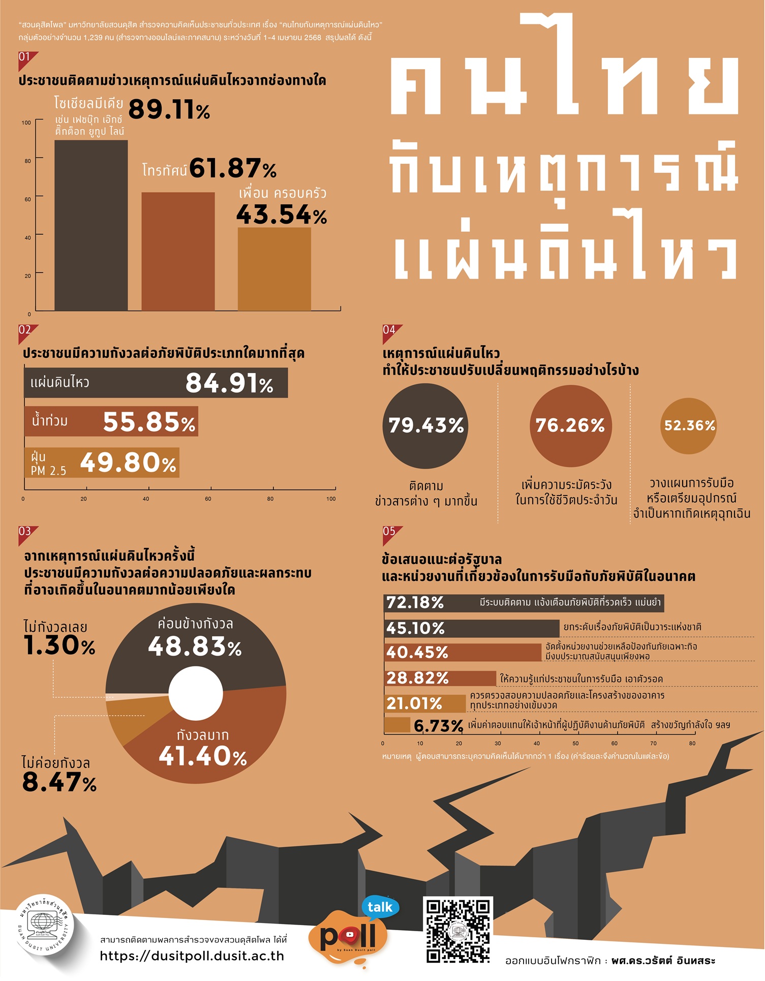 สวนดุสิตโพล มหาวิทยาลัยสวนดุสิต สำรวจความคิดเห็นประชาชนทั่วประเทศต่อกรณี “คนไทยกับเหตุการณ์แผ่นดินไหว” กลุ่มตัวอย่างจำนวน 1,239 คน (สำรวจทางออนไลน์และภาคสนาม) ระหว่างวันที่ 1-4 เมษายน 2568 พบว่า กลุ่มตัวอย่างติดตามข่าวเหตุการณ์แผ่นดินไหวจากสื่อโซเชียลมีเดีย (เฟซบุ๊ก เอ๊กซ์ ติ๊กต็อก ยูทูป ไลน์) มากที่สุด ร้อยละ 89.11 และมีความกังวลต่อภัยพิบัตินี้ ร้อยละ 84.91 จากเหตุการณ์แผ่นดินไหวครั้งนี้ทำให้ประชาชนค่อนข้างกังวลต่อความปลอดภัยและผลกระทบที่อาจเกิดขึ้นในอนาคต ร้อยละ 48.83 ส่งผลให้ประชาชนปรับเปลี่ยนพฤติกรรมโดยการติดตามข่าวสารต่างๆมากขึ้น ร้อยละ 79.43 ทั้งนี้กลุ่มตัวอย่างต้องการให้รัฐบาลและหน่วยงานที่เกี่ยวข้องมีระบบติดตาม แจ้งเตือนภัยพิบัติที่รวดเร็ว แม่นยำ ร้อยละ 72.18 รองลงมาคือ ยกระดับเรื่องภัยพิบัติเป็นวาระแห่งชาติ ร้อยละ 45.10