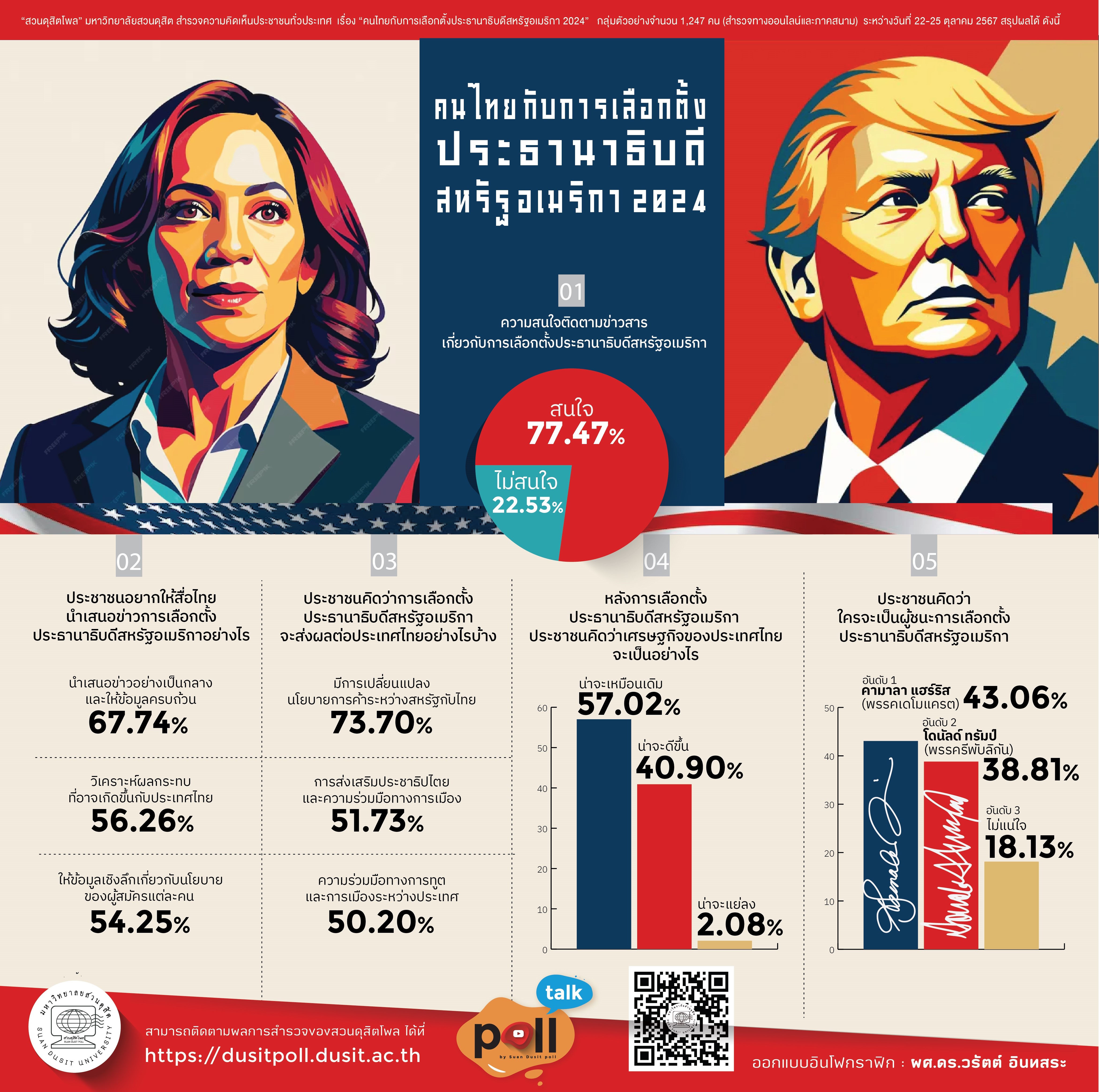 สวนดุสิตโพล มหาวิทยาลัยสวนดุสิต สำรวจความคิดเห็นประชาชนทั่วประเทศ เรื่อง “คนไทยกับการเลือกตั้งประธานาธิบดีสหรัฐอเมริกา 2024” กลุ่มตัวอย่างจำนวน 1,247 คน (สำรวจทางออนไลน์และภาคสนาม) ระหว่างวันที่ 22-25 ตุลาคม 2567 พบว่า กลุ่มตัวอย่างสนใจติดตามข่าวสารเกี่ยวกับการเลือกตั้งประธานาธิบดีสหรัฐอเมริกา ร้อยละ 77.47 อยากให้สื่อนำเสนอข่าวอย่างเป็นกลาง ให้ข้อมูลครบถ้วน ร้อยละ 67.74 โดยมองว่าการเลือกตั้งครั้งนี้จะส่งผลต่อไทยในด้านการเปลี่ยนแปลงนโยบายทางการค้าระหว่างกัน ร้อยละ 73.70 หลังการเลือกตั้งเศรษฐกิจไทยก็น่าจะยังเหมือนเดิม ร้อยละ 57.02 โดยคิดว่าคามาลา แฮร์ริส (พรรคเดโมแครต) จะชนะการเลือกตั้ง ร้อยละ 43.06