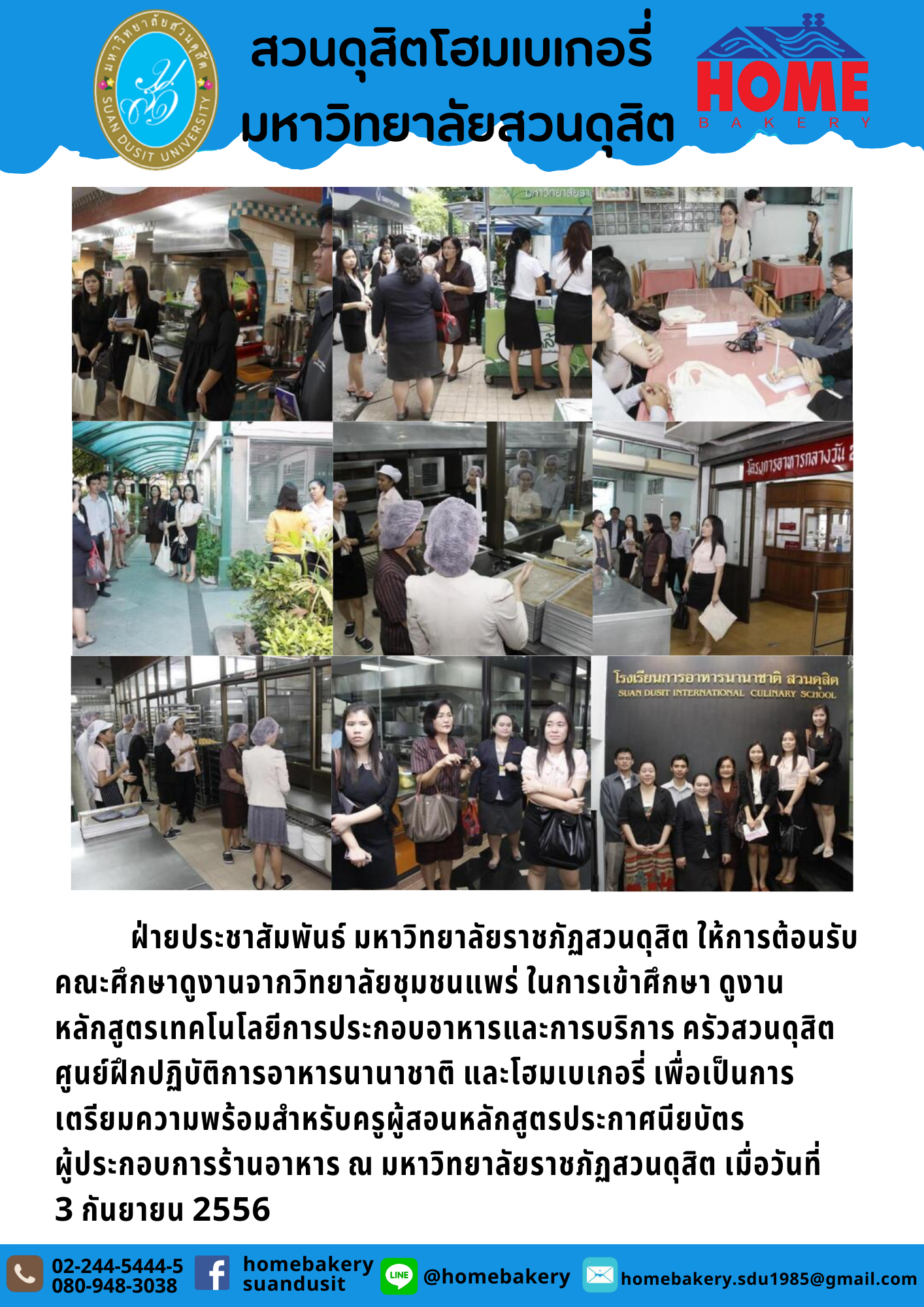 ฝ่ายประชาสัมพันธ์ มหาวิทยาลัยราชภัฏสวนดุสิต ให้การต้อนรับคณะศึกษาดูงานจากวิทยาลัยชุมชนแพร่ ในการเข้าศึกษา ดูงานหลักสูตรเทคโนโลยีการประกอบอาหารและการบริการ ครัวสวนดุสิต ศูนย์ฝึกปฏิบัติการอาหารนานาชาติ และโฮมเบเกอรี่ เพื่อเป็นการเตรียมความพร้อมสำหรับครูผู้สอนหลักสูตรประกาศนียบัตรผู้ประกอบการร้านอาหาร ณ มหาวิทยาลัยราชภัฏสวนดุสิต เมื่อวันที่ 3 กันยายน 2556