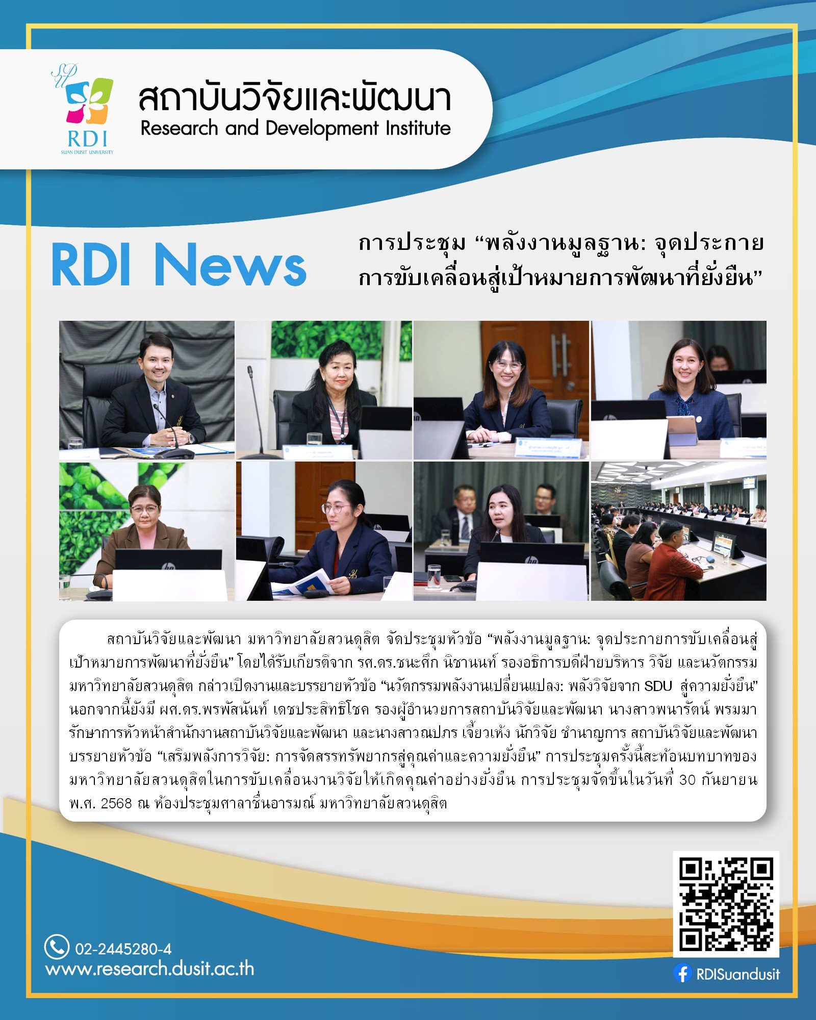 สถาบันวิจัยและพัฒนา มหาวิทยาลัยสวนดุสิต จัดประชุมหัวข้อ “พลังงานมูลฐาน: จุดประกายการขับเคลื่อนสู่เป้าหมายการพัฒนาที่ยั่งยืน” โดยได้รับเกียรติจาก รศ.ดร.ชนะศึก นิชานนท์ รองอธิการบดีฝ่ายบริหาร วิจัย และนวัตกรรม มหาวิทยาลัยสวนดุสิต กล่าวเปิดงานและบรรยายหัวข้อ “นวัตกรรมพลังงานเปลี่ยนแปลง: พลังวิจัยจาก SDU สู่ความยั่งยืน” นอกจากนี้ยังมี ผศ.ดร.พรพัสนันท์ เดชประสิทธิโชค รองผู้อำนวยการสถาบันวิจัยและพัฒนา นางสาวพนารัตน์ พรมมา รักษาการหัวหน้าสำนักงานสถาบันวิจัยและพัฒนา และนางสาวณปภร เจี้ยวเห้ง นักวิจัย ชำนาญการ สถาบันวิจัยและพัฒนา บรรยายหัวข้อ “เสริมพลังการวิจัย: การจัดสรรทรัพยากรสู่คุณค่าและความยั่งยืน” การประชุมครั้งนี้สะท้อนบทบาทของมหาวิทยาลัยสวนดุสิตในการขับเคลื่อนงานวิจัยให้เกิดคุณค่าอย่างยั่งยืน การประชุมจัดขึ้นในวันที่ 30 กันยายน พ.ศ. 2568 ณ ห้องประชุมศาลาชื่นอารมณ์ มหาวิทยาลัยสวนดุสิต