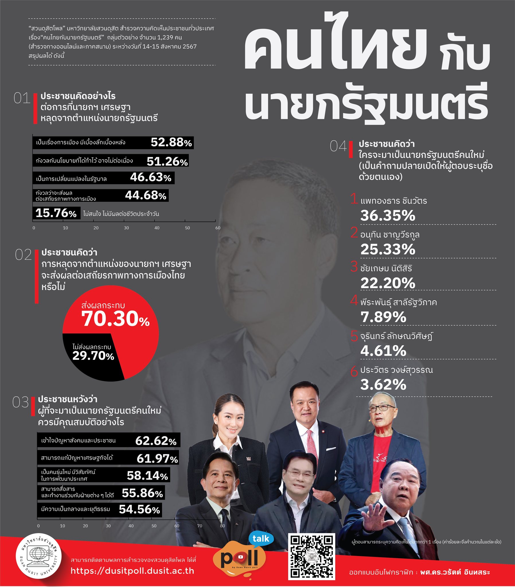 สวนดุสิตโพล มหาวิทยาลัยสวนดุสิต สำรวจความคิดเห็นประชาชนทั่วประเทศ เรื่อง “สถานการณ์การเมืองไทย ณ วันนี้” ระหว่างวันที่ 7-9 สิงหาคม 2567 กลุ่มตัวอย่างจำนวน 1,147 คน สำรวจผ่านทางออนไลน์และภาคสนาม พบว่า กลุ่มตัวอย่างสนใจข่าวการเมืองในช่วงนี้เพิ่มขึ้น ร้อยละ 43.42 โดยสนใจข่าวยุบพรรคก้าวไกลเป็นพิเศษ ร้อยละ 75.65 เมื่อเปรียบเทียบสถานการณ์การเมือง ณ วันนี้กับช่วงที่ผ่านมา คิดว่าแย่ลง ร้อยละ 67.57 ด้านความเชื่อมั่นต่อรัฐบาลเศรษฐา กลุ่มตัวอย่างรู้สึกไม่ค่อยเชื่อมั่น ร้อยละ 63.73 ด้านกระแสข่าวการปรับคณะรัฐมนตรีก็เห็นว่าควรปรับ ร้อยละ 55.62 สุดท้ายมองว่าทิศทางการเมืองไทยต่อจากนี้น่าจะแย่ลง ร้อยละ 68.44
