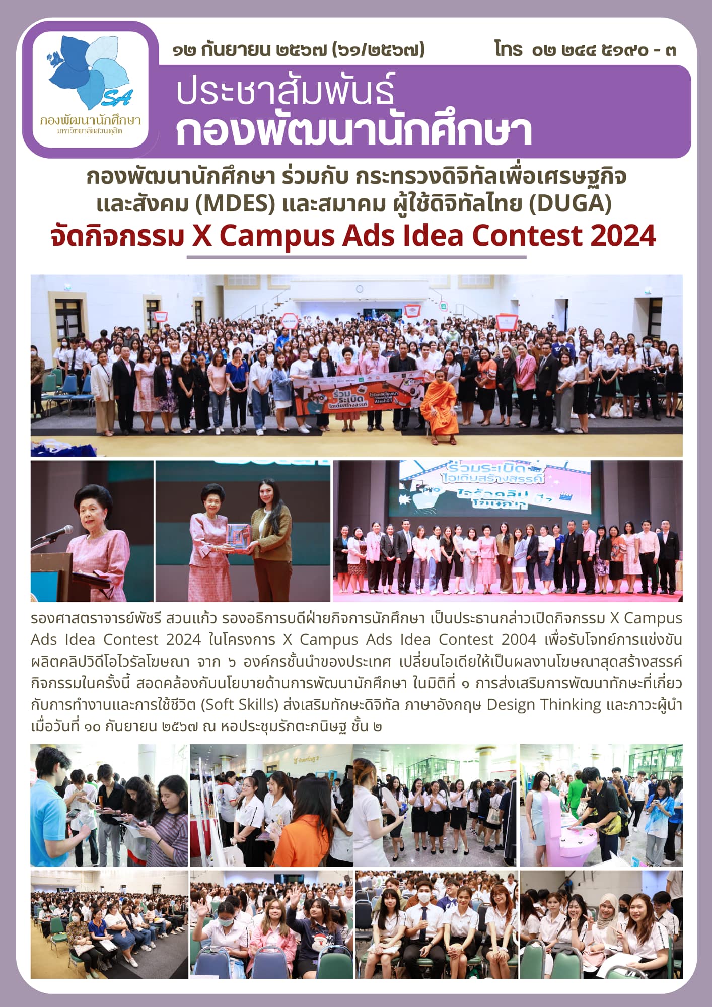 กองพัฒนานักศึกษา ร่วมกับ กระทรวงดิจิทัลเพื่อเศรษฐกิจ และสังคม (MDES) และสมาคม ผู้ใช้ดิจิทัลไทย (DUGA) จัดกิจกรรม X Campus Ads Idea Contest 2024