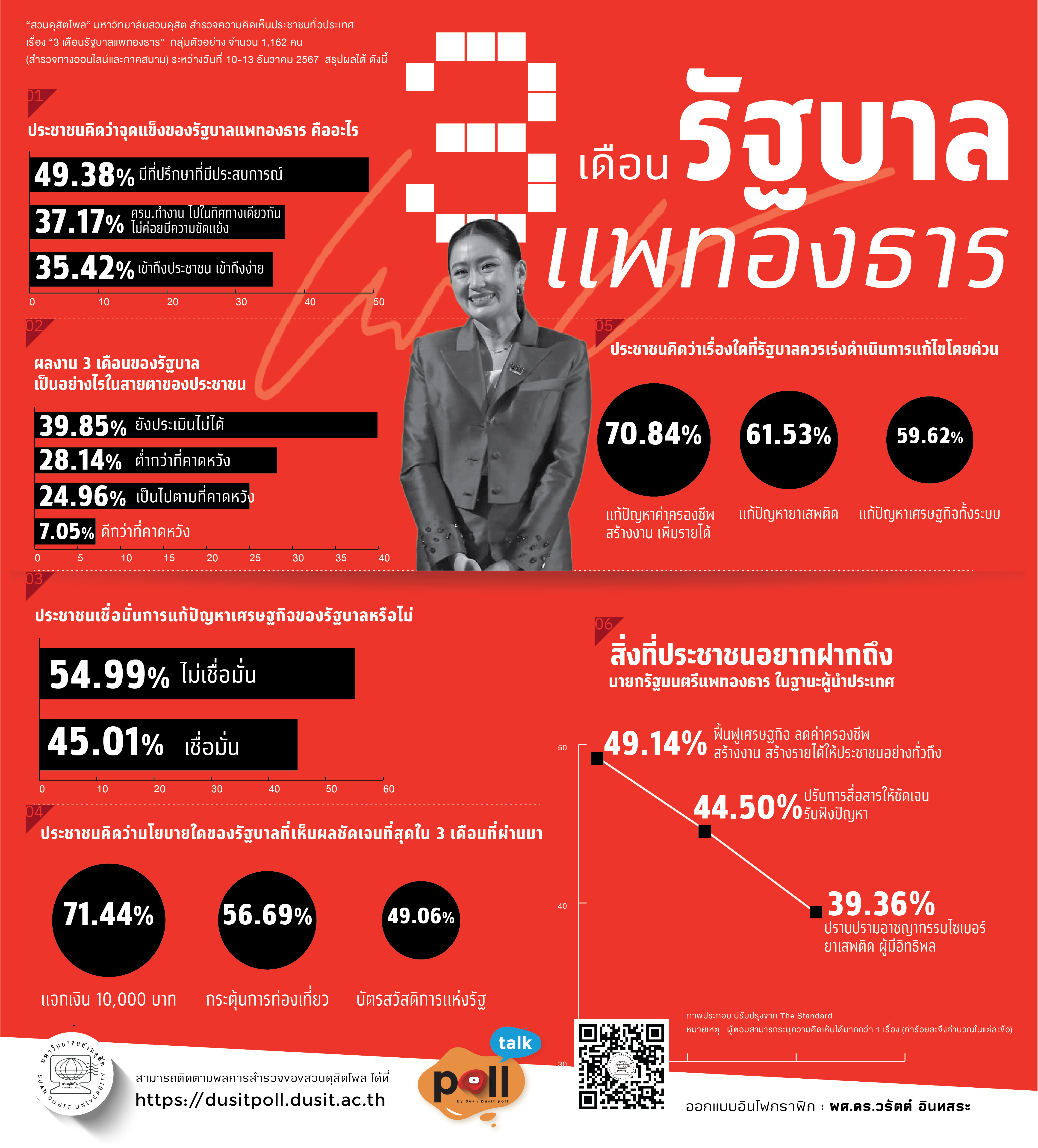 “สวนดุสิตโพล” มหาวิทยาลัยสวนดุสิต สำรวจความคิดเห็นประชาชนทั่วประเทศ เรื่อง “3 เดือนรัฐบาลแพทองธาร” กลุ่มตัวอย่าง จำนวน 1,162 คน (สำรวจทางออนไลน์และภาคสนาม) ระหว่างวันที่ 10-13 ธันวาคม 2567 พบว่า กลุ่มตัวอย่างมองจุดแข็งของรัฐบาลแพทองธาร คือ การมีที่ปรึกษาที่มีประสบการณ์ ร้อยละ 49.38 ภาพรวมผลงาน 3 เดือนของรัฐบาล ยังประเมินไม่ได้ ร้อยละ 39.85 ต่ำกว่าที่คาดหวัง ร้อยละ 28.14 และยังไม่เชื่อมั่นการแก้ปัญหาเศรษฐกิจของรัฐบาล ร้อยละ 54.99 โดยมองว่านโยบายที่เห็นผลชัดเจนที่สุดใน 3 เดือนที่ผ่านมา คือ การแจกเงิน 10,000 บาท ร้อยละ 71.44 เรื่องที่รัฐบาลควรเร่งดำเนินการแก้ไขโดยด่วนยังคงเป็นเรื่องการแก้ปัญหาค่าครองชีพ สร้างงาน เพิ่มรายได้ ร้อยละ 70.84 สุดท้ายสิ่งที่ประชาชนอยากฝากถึงนายกรัฐมนตรีแพทองธาร ในฐานะผู้นำประเทศ คือ เร่งฟื้นฟูเศรษฐกิจ ลดค่าครองชีพ สร้างงาน สร้างรายได้ให้ประชาชนอย่างทั่วถึง ร้อยละ 49.14