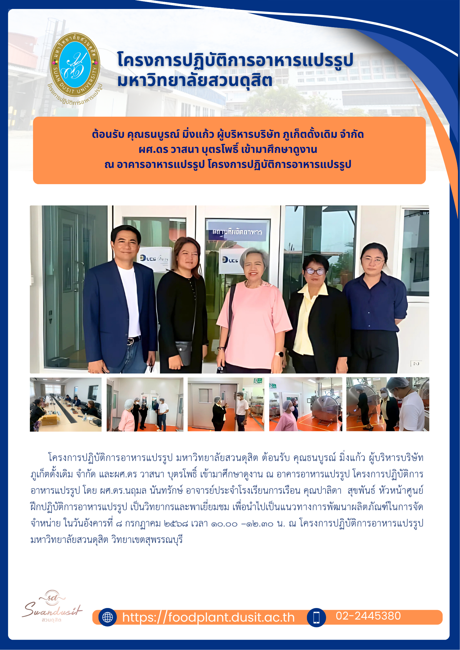 ในวันอังคารที่ ๘ กรกฏาคม ๒๕๖๘ เวลา ๑๐.๐๐ –๑๒.๓๐ น. ณ โครงการปฏิบัติการอาหารแปรรูป มหาวิทยาลัยสวนดุสิต วิทยาเขตสุพรรณบุรี
