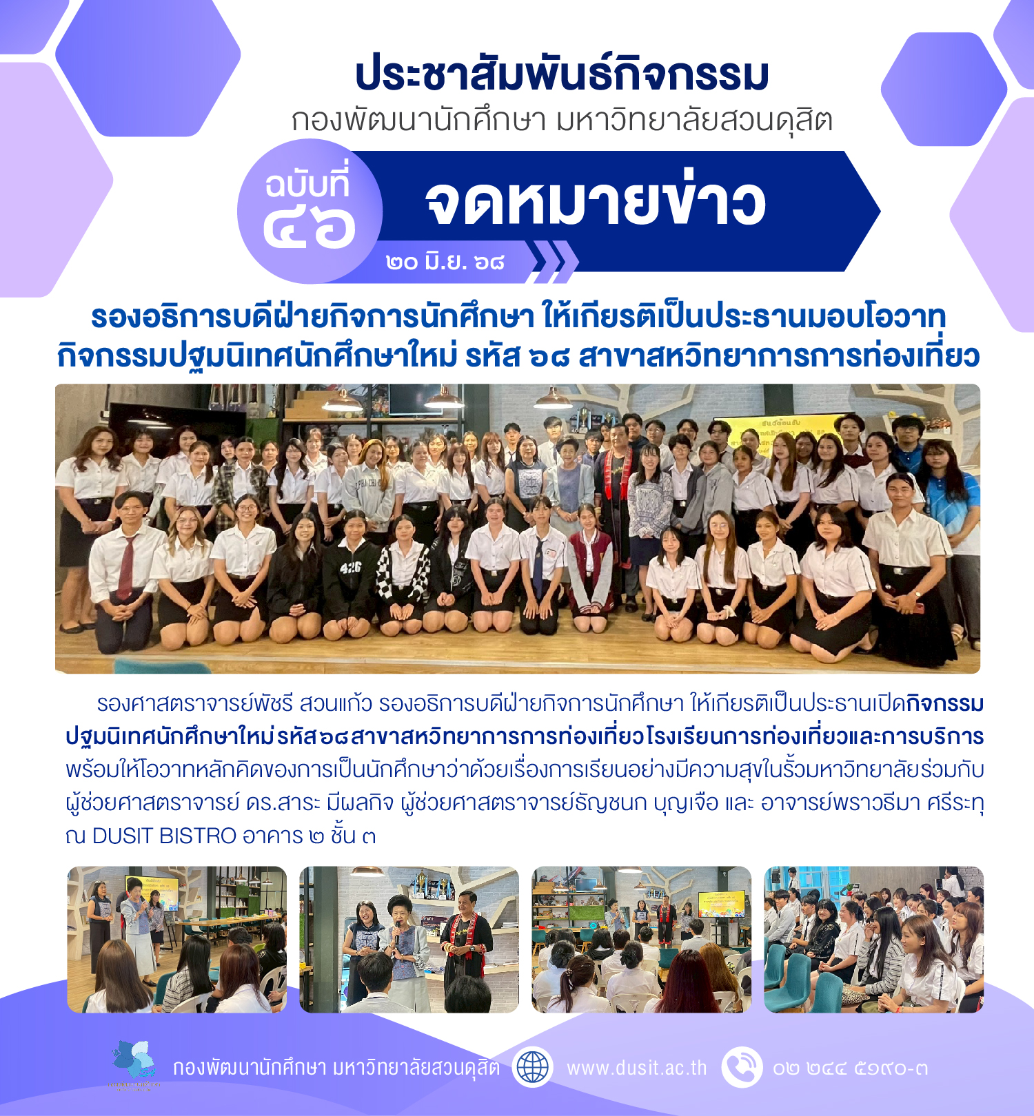 รองอธิการบดีฝ่ายกิจการนักศึกษา ให้เกียรติเป็นประธานมอบโอวาท กิจกรรมปฐมนิเทศนักศึกษาใหม่ รหัส ๖๘ สาขาสหวิทยาการการท่องเที่ยว