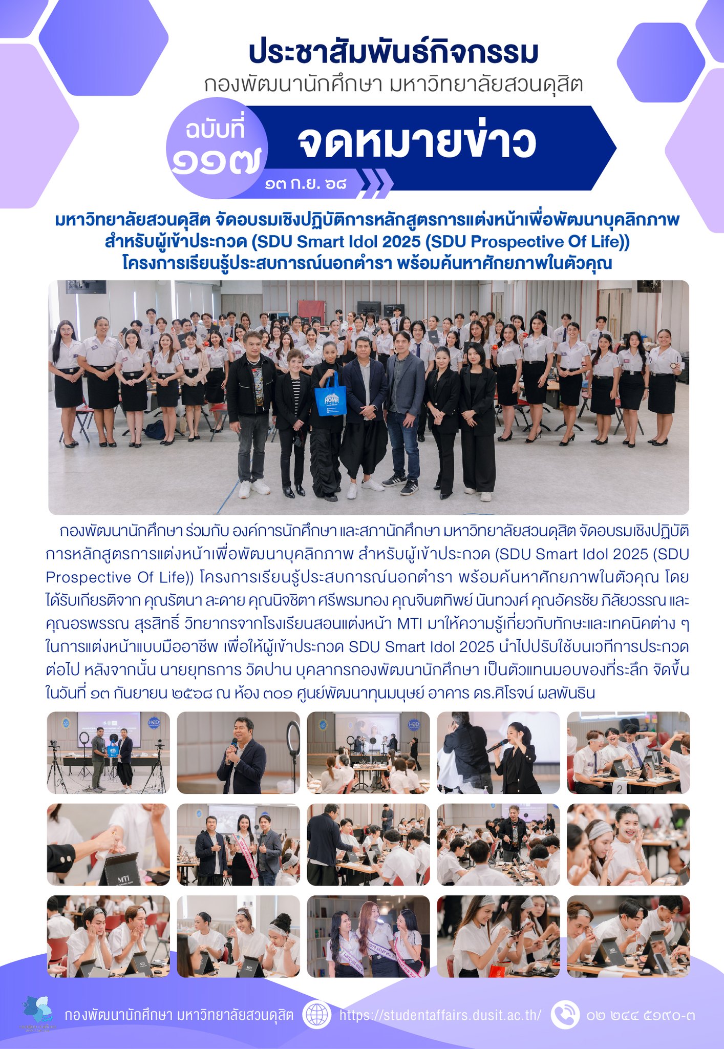 กองพัฒนานักศึกษา ร่วมกับ องค์การนักศึกษา และสภานักศึกษา มหาวิทยาลัยสวนดุสิต จัดอบรมเชิงปฏิบัติการหลักสูตรการแต่งหน้าเพื่อพัฒนาบุคลิกภาพ สำหรับผู้เข้าประกวด (SDU Smart Idol 2025 (SDU Prospective Of Life)) โครงการเรียนรู้ประสบการณ์นอกตำรา พร้อมค้นหาศักยภาพในตัวคุณ โดยได้รับเกียรติจาก คุณรัตนา ละดาย คุณนิชิตา ศรีพรมทอง คุณจินตทิพย์ นันทวงค์ คุณอัครชัย ภิเลียววรรณ และ คุณอรพรรณ สุรสิทธิ์ วิทยากรจากโรงเรียนสอนแต่งหน้า MTI มาให้ความรู้เกี่ยวกับทักษะและเทคนิคต่าง ๆ ในการแต่งหน้าแบบมืออาชีพ เพื่อให้ผู้เข้าประกวด SDU Smart Idol 2025 นำไปปรับใช้บนเวทีการประกวดต่อไป หลังจากนั้น นายยุทธการ วัดปาน บุคลากรกองพัฒนานักศึกษา เป็นตัวแทนมอบของที่ระลึก จัดขึ้นในวันที่ ๑๓ กันยายน ๒๕๖๘ ณ ห้อง ๓๐๑ ศูนย์พัฒนาทุนมนุษย์ อาคาร ดร.ศิโรจน์ ผลพันธิน