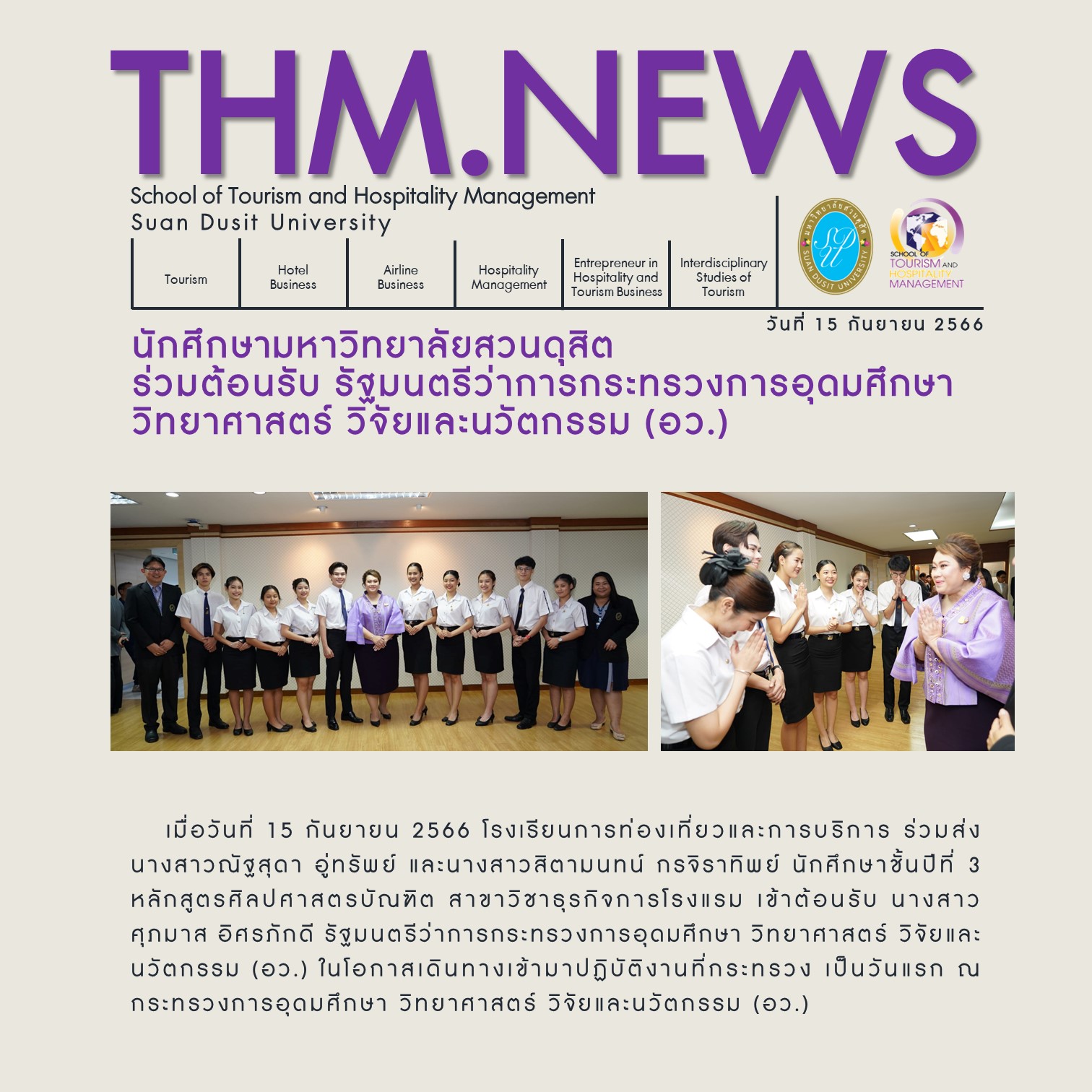 เมื่อวันที่ 15 กันยายน 2566 โรงเรียนการท่องเที่ยวและการบริการ ร่วมส่งนางสาวณัฐสุดา อู่ทรัพย์ และนางสาวสิตามนทน์ กรจิราทิพย์ นักศึกษาชั้นปีที่ 3 หลักสูตรศิลปศาสตรบัณฑิต สาขาวิชาธุรกิจการโรงแรม เข้าต้อนรับ นางสาวศุภมาส อิศรภักดี รัฐมนตรีว่าการกระทรวงการอุดมศึกษา วิทยาศาสตร์ วิจัยและนวัตกรรม (อว.) ในโอกาสเดินทางเข้ามาปฏิบัติงานที่กระทรวง เป็นวันแรก ณ กระทรวงการอุดมศึกษา วิทยาศาสตร์ วิจัยและนวัตกรรม (อว.)