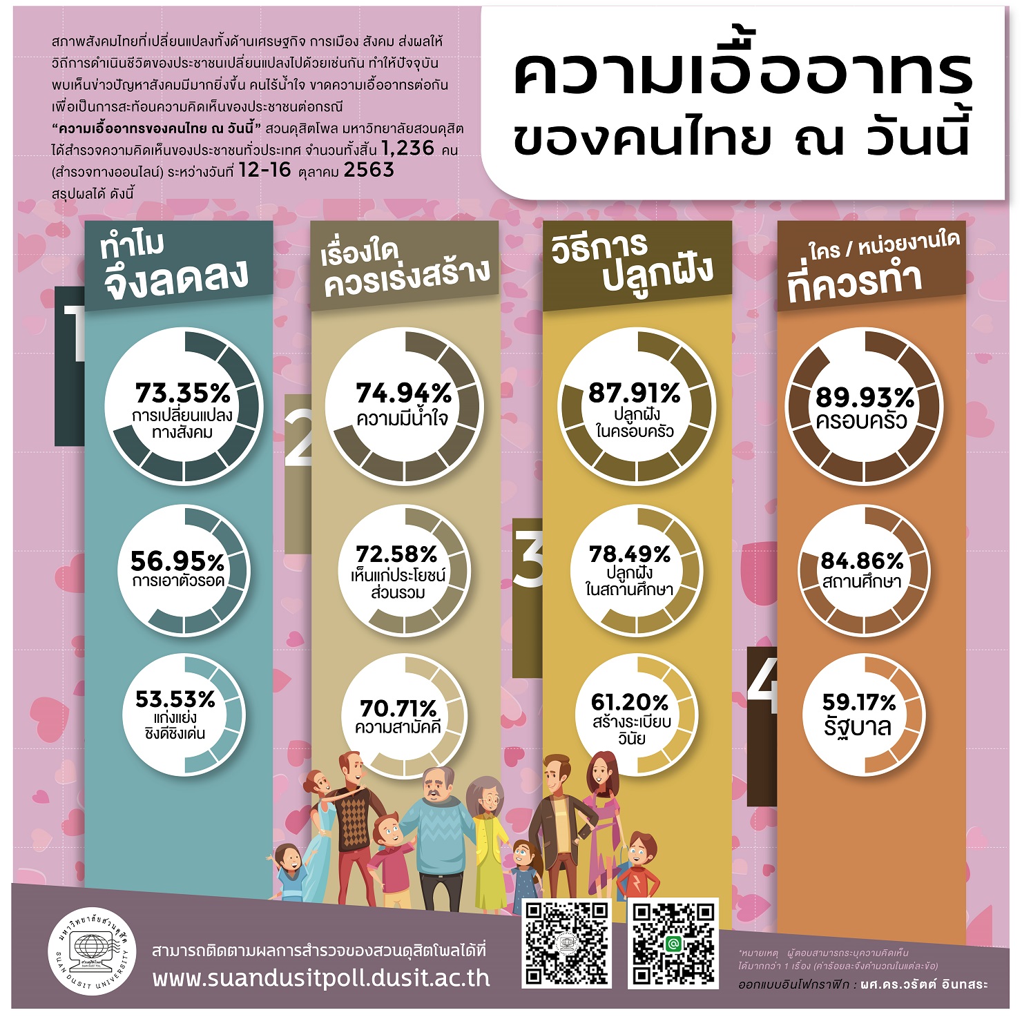 สวนดุสิตโพล มหาวิทยาลัยสวนดุสิต ได้สำรวจความคิดเห็นของประชาชนจำนวน 1,236 คน ระหว่างวันที่ 12–16 ตุลาคม 2563 เพื่อสะท้อนมุมมองต่อ “ความเอื้ออาทรของคนไทย” ท่ามกลางบริบทเศรษฐกิจและสังคมที่เปลี่ยนแปลง ผลสำรวจพบว่าสาเหตุหลักที่ความเอื้ออาทรลดลงคือการเปลี่ยนแปลงทางสังคม การเอาตัวรอด และการแข่งขันกันเอง ขณะที่ประชาชนเห็นว่าควรเร่งปลูกฝังคุณค่าความมีน้ำใจ ความสามัคคี และความเห็นแก่ประโยชน์ส่วนรวม โดยเน้นบทบาทของครอบครัวและสถานศึกษาในการปลูกฝังอย่างจริงจัง โดยเฉพาะในสถานการณ์ที่เศรษฐกิจถดถอยและปัญหาสังคมรุนแรงขึ้น ผลการสำรวจตอกย้ำว่าความเอื้ออาทรไม่ใช่เพียงคุณลักษณะเชิงอารมณ์ แต่เป็นทุนทางสังคมสำคัญในการสร้างความมั่นคงและความหวังให้แก่สังคมไทย