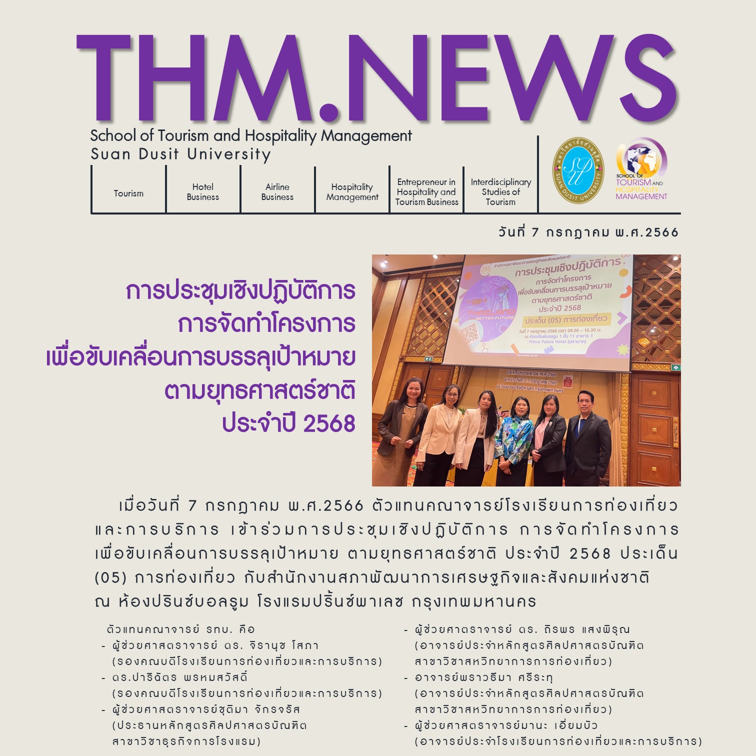 เมื่อวันที่ 7 กรกฏาคม 2566 ตัวแทนคณาจารย์โรงเรียนการท่องเที่ยวและการบริการ เข้าร่วมการประชุมเชิงปฏิบัติการ การจัดทำโครงการเพื่อขับเคลื่อนการบรรลุเป้าหมาย ตามยุทธศาสตร์ชาติ ประจำปี 2568 ประเด็น (05) การท่องเที่ยว กับสำนักงานสภาพัฒนาการเศรษฐกิจและสังคมแห่งชาติ ณ ห้องปรินซ์บอลรูม โรงแรมปริ้นซ์พาเลซ กรุงเทพมหานคร ตัวแทน รทบ. คือ ผู้ช่วยศาตราจารย์ ดร.จิรานุช โสภา (รองคณบดีโรงเรียนนการท่องเที่ยวและการบริการ) ดร.ปาริฉัตร พรหมสวัสดิ์ (รองคณบดีโรงเรียนการท่องเที่ยวและการบริการ) ผู้ช่วยศาสตราจารย์ชุติมา จักรจรัส (ประธานหลักสูตรศิลปศาสตรบัณฑิต สาขาธุรกิจการโรงแรม) ผู้ช่วยศาสตราจารย์ ดร.ถิรพร แสงพิรุณ (อาจารย์ประจำหลักสูตรสาขาวิชาสหวทิยาการการท่องเที่ยว) อาจารย์พราวธีมา ศรีระทุ (อาจารย์ประจำหลักสูตรสาขาวิชาสหวทิยาการการท่องเที่ยว) ผู้ช่วยศาสตราจารย์มานะ เอี่ยมบัว (อาจารย์ประจำโรงเรียนการท่องเที่ยวและการบริการ)
