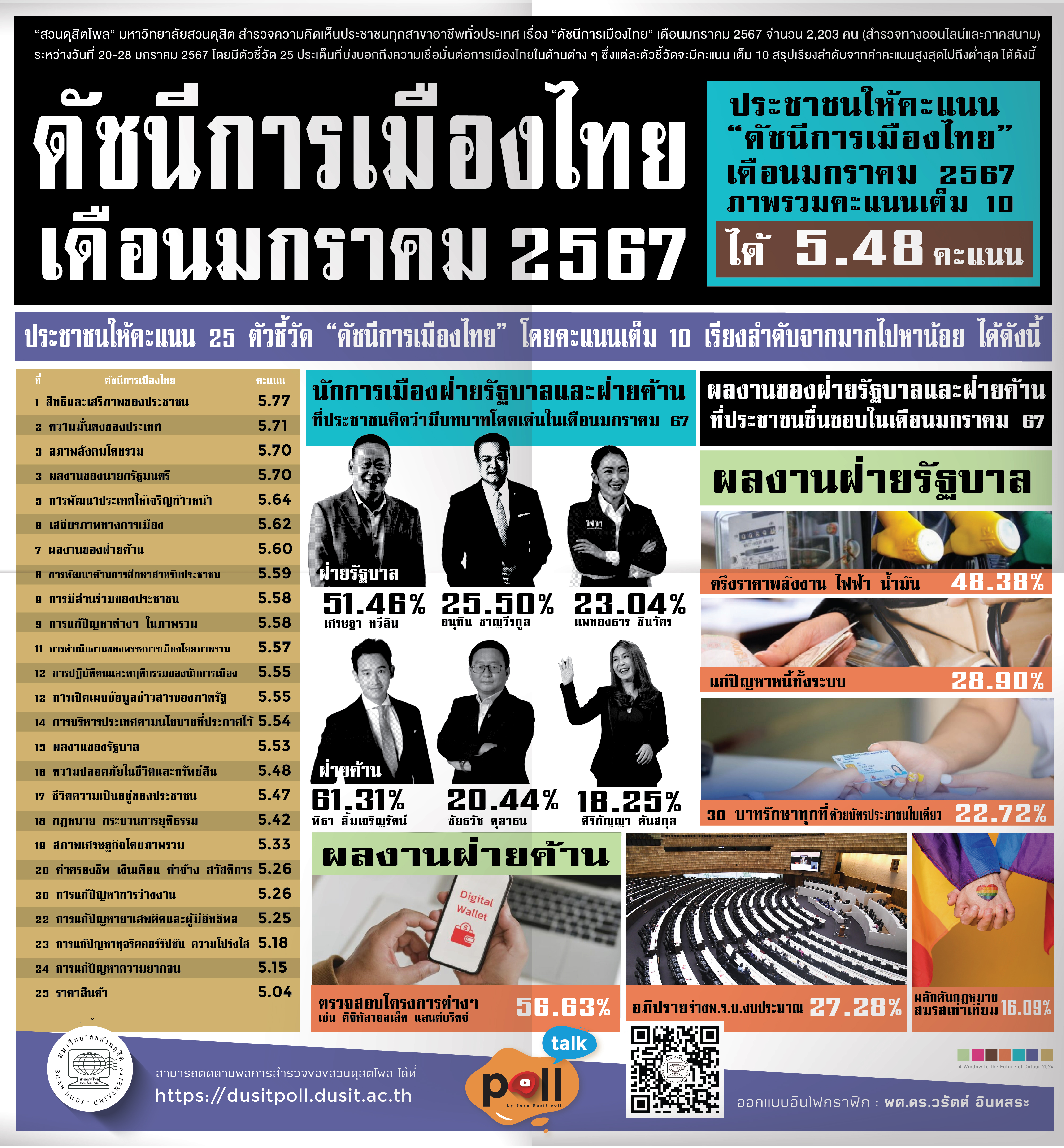 สวนดุสิตโพล มหาวิทยาลัยสวนดุสิต ดำเนินการสำรวจดัชนีการเมืองไทย ประจำเดือนมกราคม 2567 โดยสำรวจความคิดเห็นจากประชาชนทุกสาขาอาชีพทั่วประเทศ จำนวน 2,203 คน (สำรวจทางออนไลน์และภาคสนาม) เน้นตัวชี้วัด
