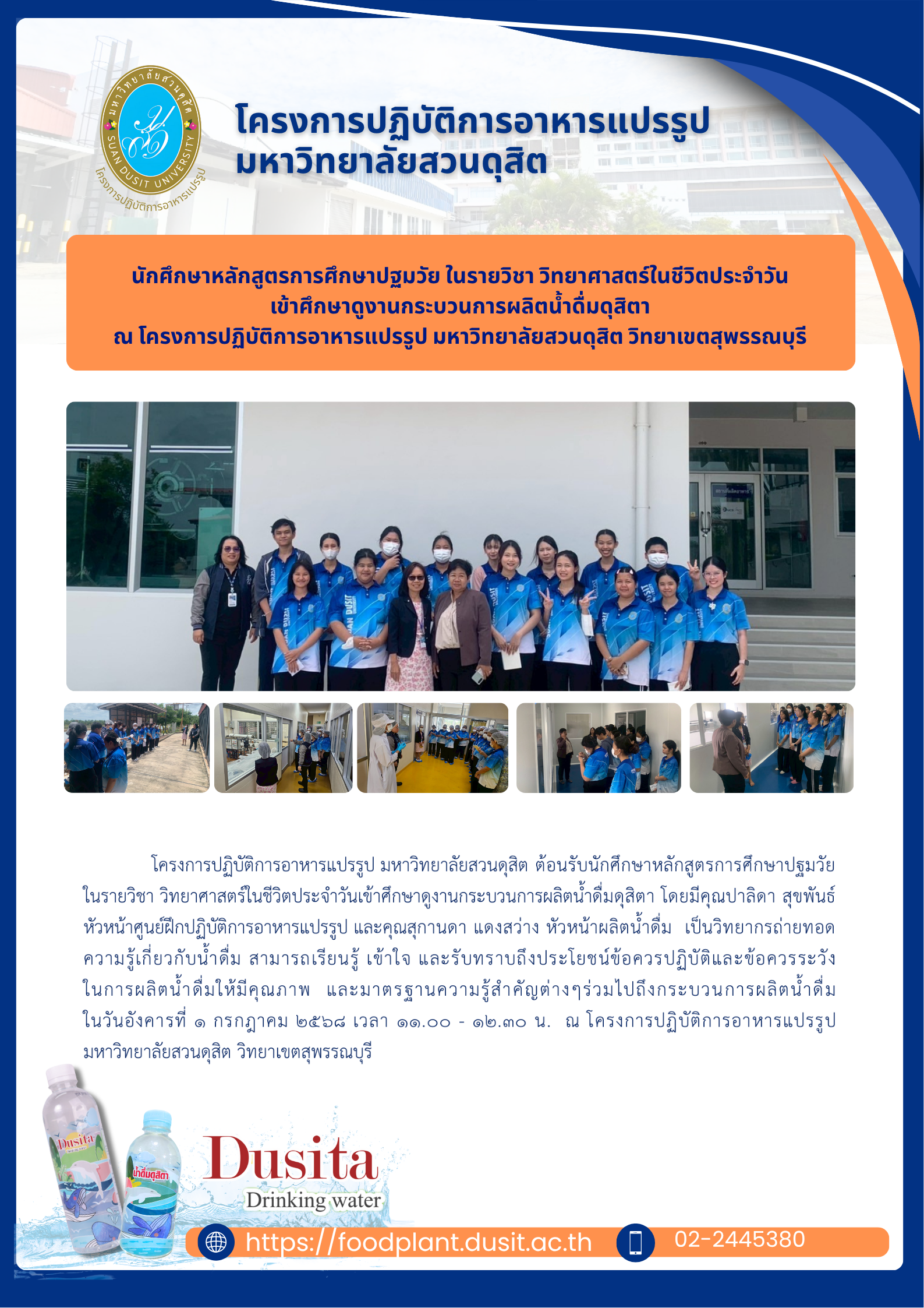 โครงการปฏิบัติการอาหารแปรรูป มหาวิทยาลัยสวนดุสิต ต้อนรับนักศึกษาหลักสูตรการศึกษาปฐมวัย ในรายวิชา วิทยาศาสตร์ในชีวิตประจําวันเข้าศึกษาดูงานกระบวนการผลิตนํ้าดื่มดุสิตา