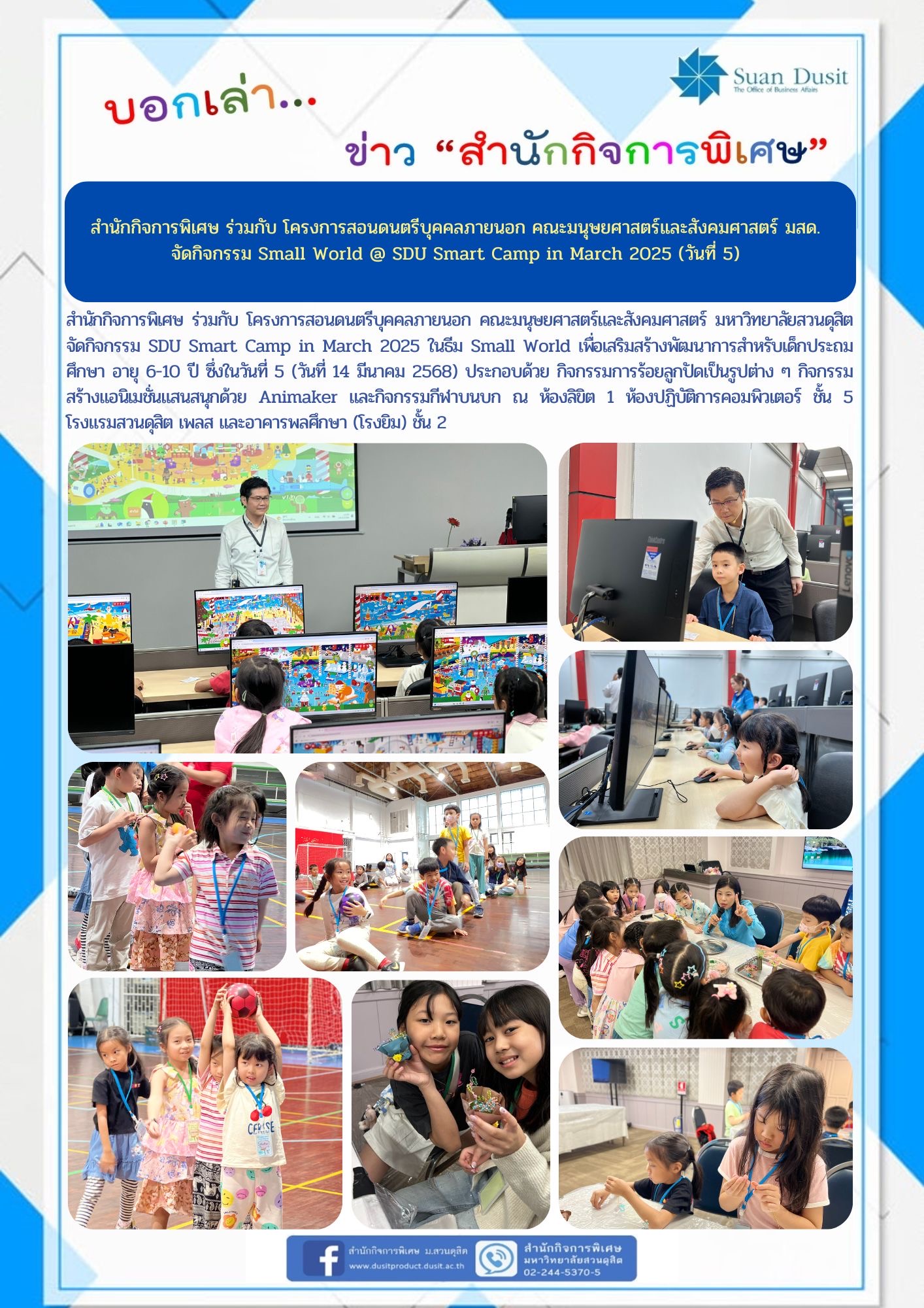 สำนักกิจการพิเศษ ร่วมกับ โครงการสอนดนตรีบุคคลภายนอก คณะมนุษยศาสตร์และสังคมศาสตร์ มหาวิทยาลัยสวนดุสิต จัดกิจกรรม SDU Smart Camp in March 2025 ในธีม Small World เพื่อเสริมสร้างพัฒนาการสำหรับเด็กประถมศึกษา อายุ 6-10 ปี โดยนำองค์ความรู้ด้านกีฬาสำหรับเด็ก การทำอาหาร ศิลปะ วิทยาศาสตร์ ภาษาอังกฤษ วัฒนธรรมจีน และความรู้ทาง IT มาบูรณาการร่วมกัน ระหว่างวันที่ 10-28 มีนาคม 2568 ซึ่งในวันที่ 5 (วันที่ 14 มีนาคม 2568) ประกอบด้วย กิจกรรมศิลปะประดิษฐ์ การร้อยลูกปัดเป็นรูปต่าง ๆ โดยโรงเรียนการเรือน กิจกรรม IT สร้างแอนิเมชั่นแสนสนุกด้วย Animaker โดยคณะครุศาสตร์ และกิจกรรมกีฬาบนบก Play and Games โดยโครงการศูนย์บริหารกายเพื่อสุขภาพ สำนักกิจการพิเศษ ณ ห้องลิขิต 1 ห้องปฏิบัติการคอมพิวเตอร์ ชั้น 5 โรงแรมสวนดุสิต เพลส และอาคารพลศึกษา (โรงยิม) ชั้น 2