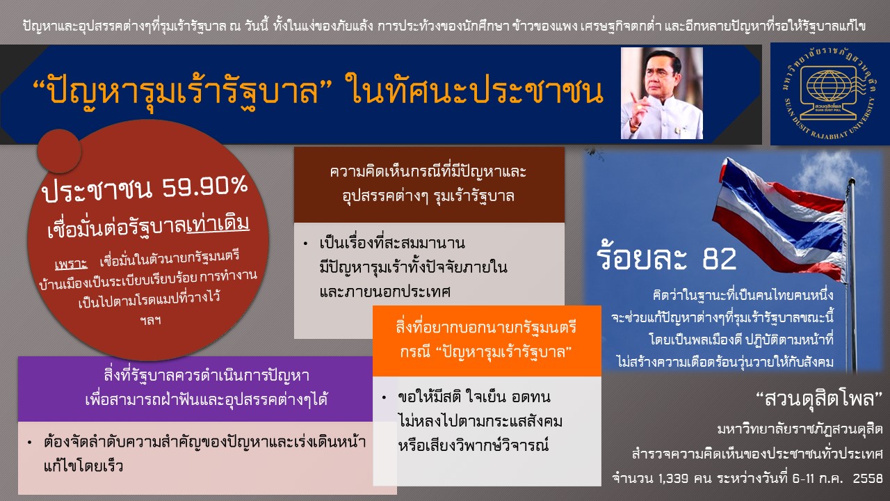 การสำรวจความคิดเห็นของประชาชนทั่วประเทศจำนวน 1,339 คน โดยสวนดุสิตโพล มหาวิทยาลัยราชภัฏสวนดุสิต ระหว่างวันที่ 6-11 กรกฎาคม พ.ศ. 2558 มีวัตถุประสงค์เพื่อสะท้อนทัศนะของประชาชนต่อปัญหาที่รุมเร้ารัฐบาลในช่วงเวลานั้น เช่น ภัยแล้ง เศรษฐกิจตกต่ำ ข้าวของแพง และการเคลื่อนไหวของนักศึกษา ประชาชนส่วนใหญ่มองว่าปัญหาเหล่านี้เป็นเรื่องที่สะสมมานาน มีทั้งปัจจัยภายในและภายนอก หากไม่เร่งแก้ไขอาจกระทบต่อความมั่นคงของประเทศ และถือเป็นบททดสอบความสามารถของรัฐบาล ข้อเสนอแนะหลักคือ รัฐบาลควรจัดลำดับความสำคัญของปัญหา ทำงานด้วยความจริงใจ และสร้างความร่วมมือทุกภาคส่วน พร้อมทั้งกระตุ้นเศรษฐกิจและมีนโยบายที่ชัดเจน สำหรับบทบาทของประชาชน ส่วนใหญ่เห็นว่าควรเป็นพลเมืองดี ไม่สร้างความวุ่นวาย ให้ความร่วมมือกับภาครัฐ และร่วมกันสร้างสังคมที่เข้มแข็ง ทั้งนี้ ความเชื่อมั่นของประชาชนส่วนใหญ่ยังคงอยู่ในระดับเดิม และต้องการให้นายกรัฐมนตรีมีสติ ยึดมั่นในความถูกต้อง และใส่ใจปัญหาปากท้องของประชาชนเป็นลำดับแรก