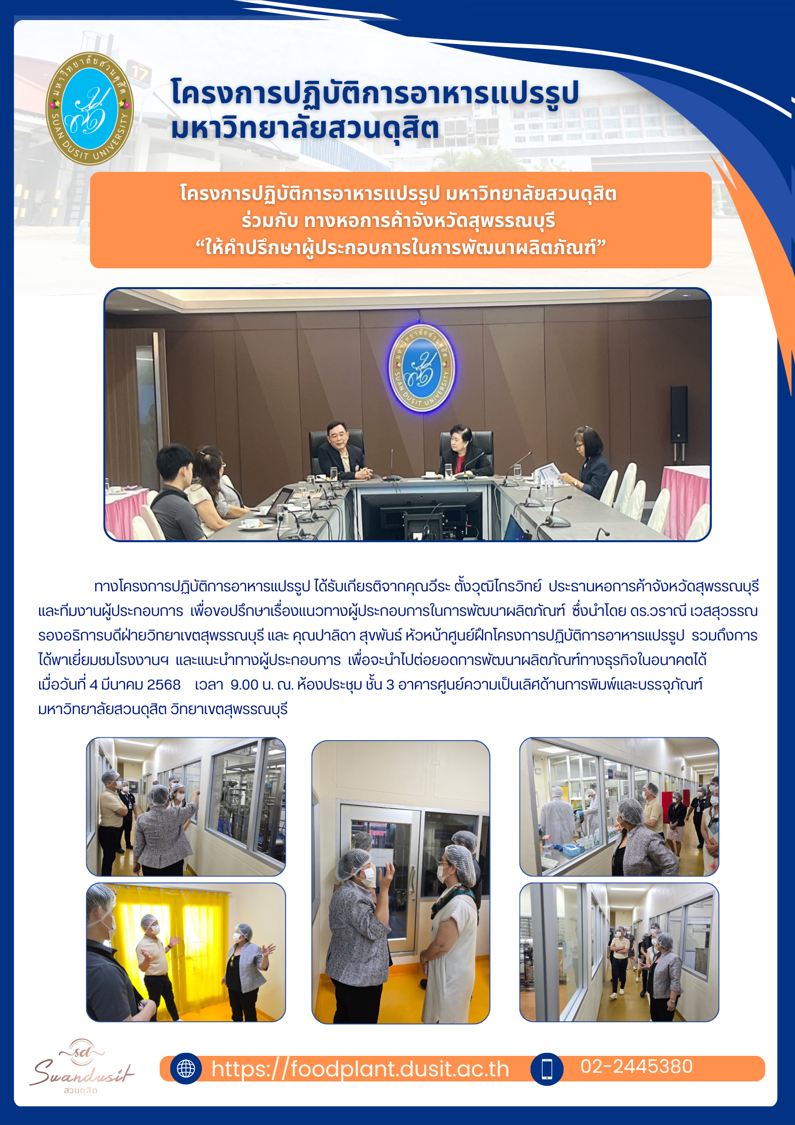 ในวันที่ 4 มีนาคม 2568 ณ. ห้องประชุม ชั้น 3 อาคารศูนย์ความเป็นเลิศด้านการพิมพ์และบรรจุภัณฑ์ มหาวิทยาลัยสวนดุสิต วิทยาเขตสุพรรณบุรี