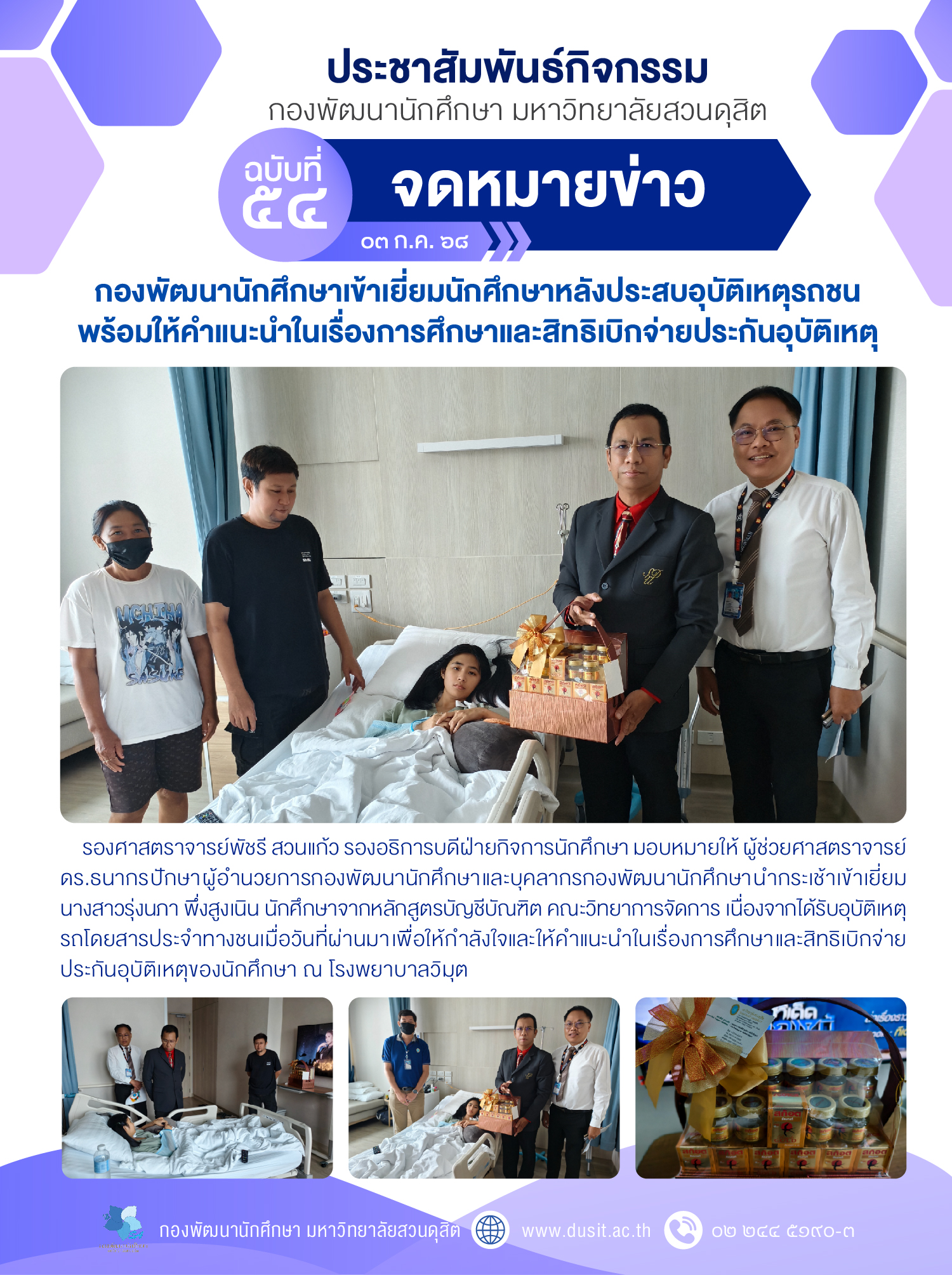 รองศาสตราจารย์ พัชรี สวนแก้ว รองอธิการบดีฝ่ายกิจการนักศึกษา ได้มอบหมายให้ ผศ.ดร.ธนากร ปักษา ผู้อำนวยการกองพัฒนานักศึกษา และบุคลากร นำกระเช้าเข้าเยี่ยม นางสาวรุ่งนภา พึ่งสูงเนิน นักศึกษาจากหลักสูตรบัญชีบัณฑิต คณะวิทยาการจัดการ ณ โรงพยาบาลวิมุต เนื่องจากนักศึกษาประสบอุบัติเหตุรถโดยสารประจำทางชนเมื่อวันที่ผ่านมา เพื่อให้กำลังใจและให้คำแนะนำในเรื่องการศึกษาและสิทธิการเบิกจ่ายประกันอุบัติเหตุของนักศึกษา