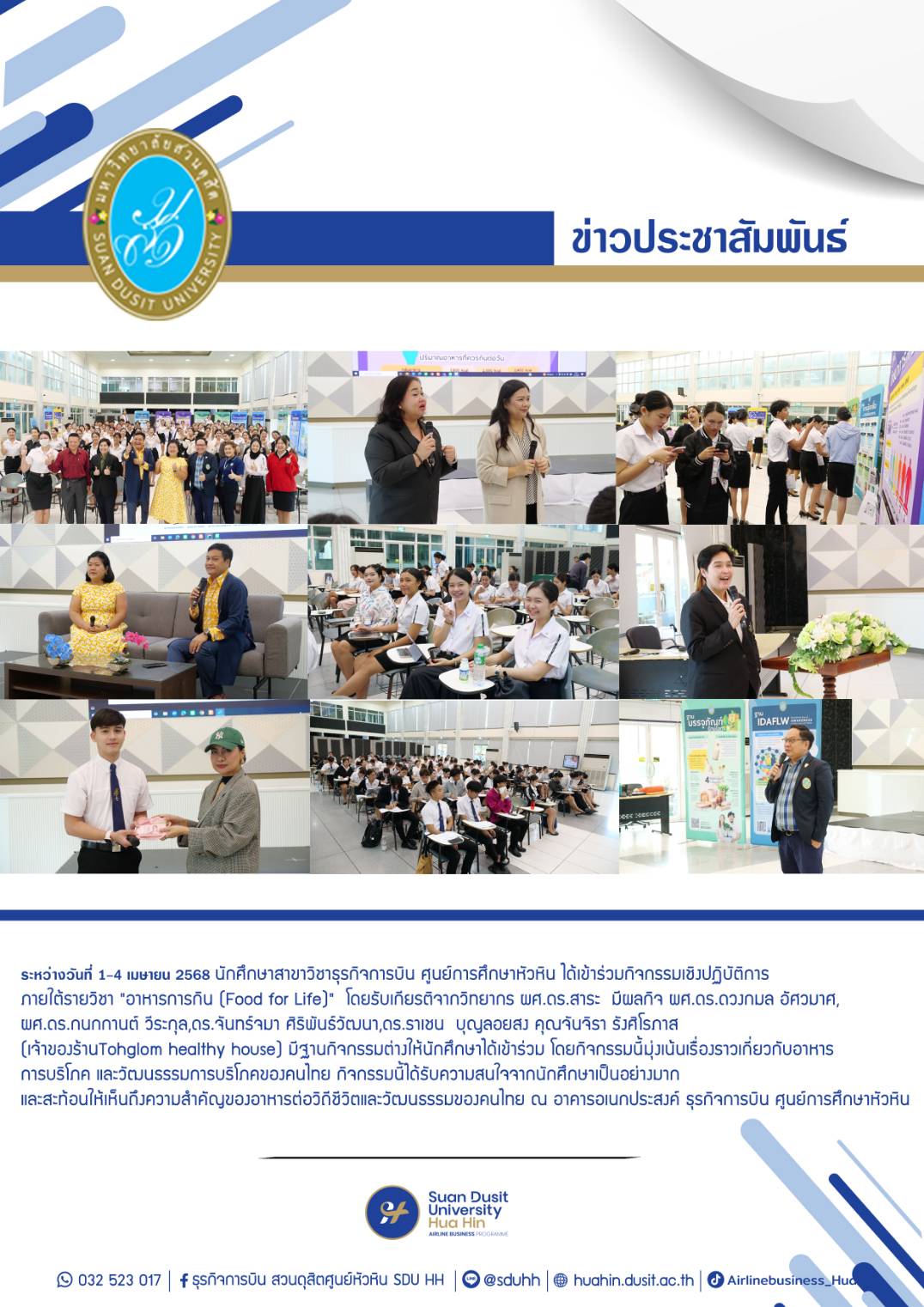 | dc.description | ระหว่างวันที่ 1-4 เมษายน 2568 นักศึกษาสาขาวิชาธุรกิจการบิน ศูนย์การศึกษาหัวหิน ได้เข้าร่วมกิจกรรมเชิงปฏิบัติการ ภายใต้รายวิชา อาหารการกิน (Food for Life)" โดยรับเกียรติจากวิทยากร ผศ.ดร.สาระ มีผลกิจ ผศ.ดร.ดวงกมล อัศวมาศ ผศ.ดร.กนกกานต์ วีระกุล ดร.จันทร์จมา ศิริพันธ์วัฒนา ดร.ราเชน บุญลอยสง คุณจันจิรา รังศิโรภาส (เจ้าของร้าน Tohglom healthy house) มีฐานกิจกรรมต่างให้นักศึกษาได้เข้าร่วม โดยกิจกรรมนี้มุ่งเน้นเรื่องราวเกี่ยวกับอาหาร การบริโภค และวัฒนธรรมการบริโภคของคนไทย กิจกรรมนี้ได้รับความสนใจจากนักศึกษาเป็นอย่างมาก และสะท้อนให้เห็นถึงความสำคัญของอาหารต่อวิถีชีวิตและวัฒนธรรมของคนไทย ณ อาคารอเนกประสงค์ ธุรกิจการบิน ศูนย์การศึกษาหัวหิน | |