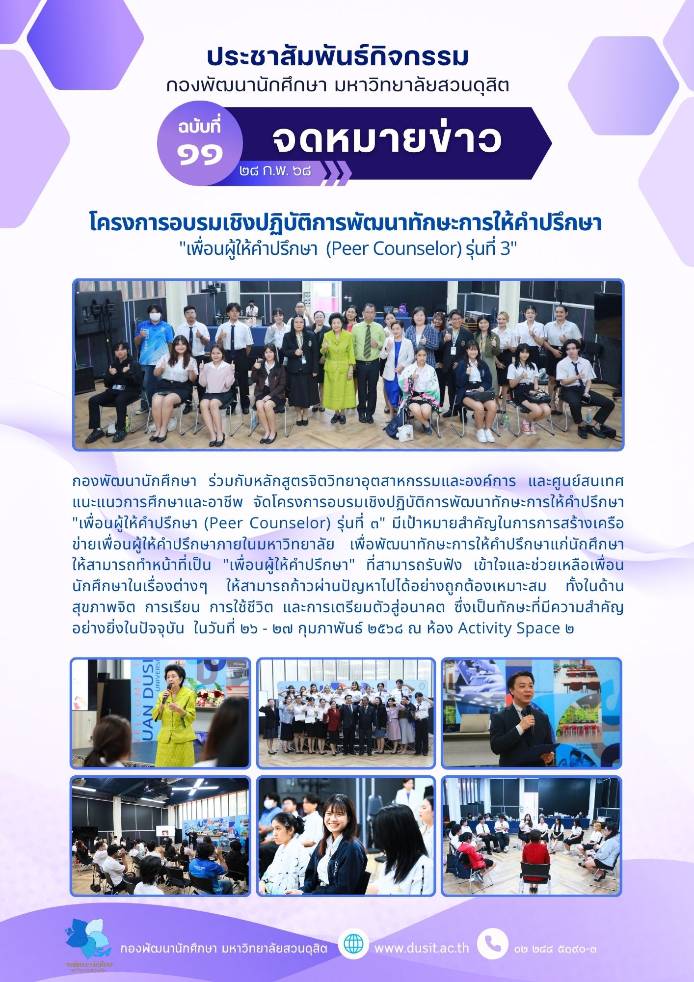 กองพัฒนานักศึกษา ร่วมกับหลักสูตรจิตวิทยาอุตสาหกรรมและองค์การ และศูนย์สนเทศแนะแนวการศึกษาและอาชีพ จัดโครงการอบรมเชิงปฏิบัติการพัฒนาทักษะการให้คำปรึกษา "เพื่อนผู้ให้คำปรึกษา (Peer Counselor) รุ่นที่ 3" โดยมีเป้าหมายสำคัญในการการสร้างเครือข่ายเพื่อนผู้ให้คำปรึกษาภายในมหาวิทยาลัย พัฒนาทักษะการให้คำปรึกษาแก่นักศึกษา เพื่อให้สามารถทำหน้าที่เป็น "เพื่อนผู้ให้คำปรึกษา" ที่สามารถรับฟัง เข้าใจ และช่วยเหลือเพื่อนนักศึกษาในเรื่องต่างๆ ให้สามารถก้าวผ่านปัญหาต่างๆ ไปได้อย่างถูกต้องเหมาะสม ทั้งในด้านสุขภาพจิต การเรียน การใช้ชีวิต และการเตรียมตัวสู่อนาคต ซึ่งเป็นทักษะที่มีความสำคัญอย่างยิ่งในปัจจุบัน ในวันที่ 26 – 27 กุมภาพันธ์ 2568 ณ ห้อง Activity Space 2