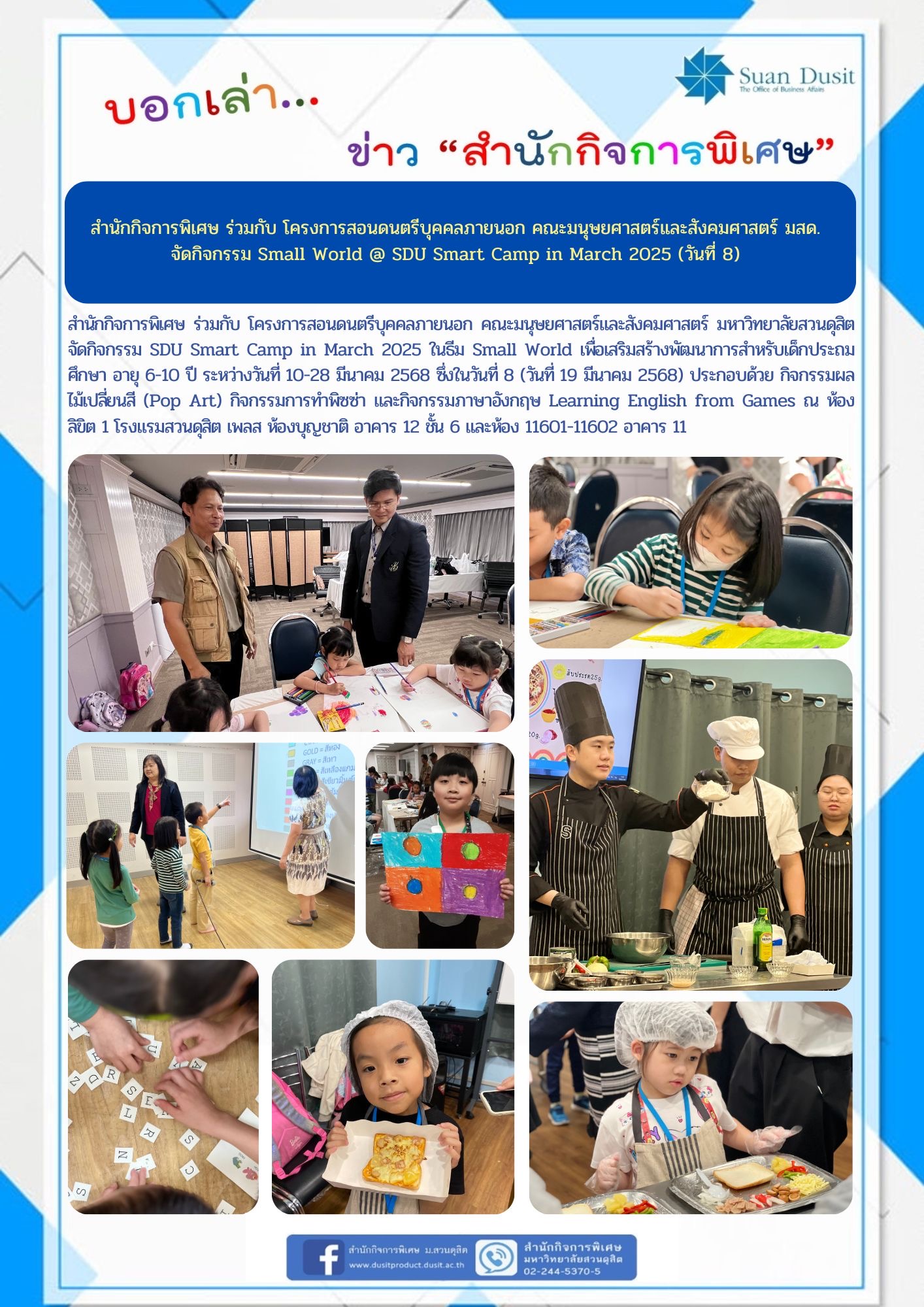 สำนักกิจการพิเศษ ร่วมกับ โครงการสอนดนตรีบุคคลภายนอก คณะมนุษยศาสตร์และสังคมศาสตร์ มหาวิทยาลัยสวนดุสิต จัดกิจกรรม SDU Smart Camp in March 2025 ในธีม Small World เพื่อเสริมสร้างพัฒนาการสำหรับเด็กประถมศึกษา อายุ 6-10 ปี โดยนำองค์ความรู้ด้านกีฬาสำหรับเด็ก การทำอาหาร ศิลปะ วิทยาศาสตร์ ภาษาอังกฤษ วัฒนธรรมจีน และความรู้ทาง IT มาบูรณาการร่วมกัน ระหว่างวันที่ 10-28 มีนาคม 2568 ซึ่งในวันที่ 8 (วันที่ 19 มีนาคม 2568)