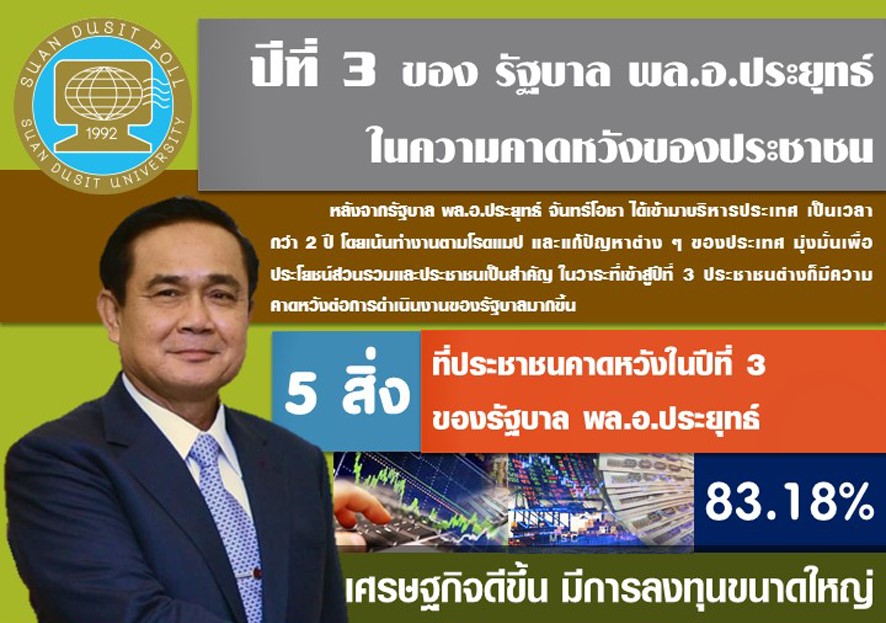 ในวาระที่รัฐบาล พล.อ.ประยุทธ์ จันทร์โอชา เข้าสู่ปีที่ 3 ของการบริหารประเทศ “สวนดุสิตโพล” ได้สำรวจความคิดเห็นของประชาชนจำนวน 1,374 คน ระหว่างวันที่ 20–30 กันยายน 2559 เพื่อสะท้อนความคาดหวังต่อการทำงานของรัฐบาล พบว่าประชาชนส่วนใหญ่อยากเห็นเศรษฐกิจดีขึ้น มีการลงทุนพัฒนาโครงสร้างพื้นฐาน และคุณภาพชีวิตของประชาชนดีขึ้น พร้อมคาดหวังให้เกิดความสามัคคี และการเมืองที่เป็นประชาธิปไตย อย่างไรก็ตาม ประชาชนยังมีมุมมองที่หลากหลายต่อความเป็นไปได้ของความหวังนี้ โดย 48.31% เชื่อว่าจะสมหวัง ขณะที่อีก 27.90% ยังไม่แน่ใจ และ 23.79% คิดว่าอาจไม่เป็นไปตามที่หวัง ผู้ที่ประชาชนมองว่าจะมีบทบาทสำคัญในการทำให้สมหวังคือ นายกรัฐมนตรี พล.อ.ประยุทธ์ รองลงมาคือภาคประชาชน คณะรัฐมนตรี ภาคเอกชน และข้าราชการ สะท้อนให้เห็นว่าความหวังของประชาชนยังผูกโยงกับผู้นำที่มีบทบาทชัดเจน และการร่วมมือกันของทุกภาคส่วน
