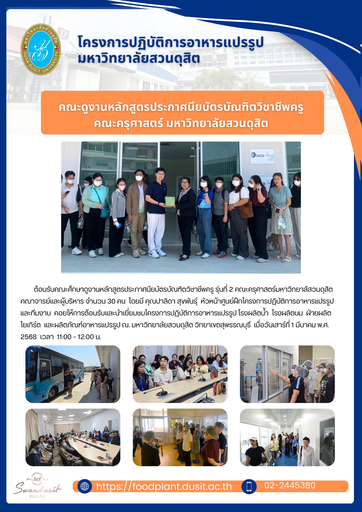 ในวันเสาร์ที่ 1 มีนาคม พ.ศ. 2568 เวลา 11:00 – 12:00 น. ทางหลักสูตรประกาศนียบัตรบัณฑิตวิชาชีพครู รุ่นที่ 2 คณะครุศาสตร์ มหาวิทยาลัยสวนดุสิต คณาจารย์และผู้บริหาร เข้าเยี่ยมชมโครงการปฏิบัติการอาหารแปรรูป โรงผลิตน้ำ โรงผลิตนม ฝ่ายผลิตโยเกิร์ต และผลิตภัณฑ์แปรรูป โดยมีคุณปาลิดา สุขพันธุ์ หัวหน้าศูนย์ฝึกโครงการปฏิบัติการอาหารแปรรูป และทีมงาน ได้อบรมให้การแนะนำกับทางคณะดูงาน เพื่อเป็นแนวทางในเชิงปฏิบัติการได้