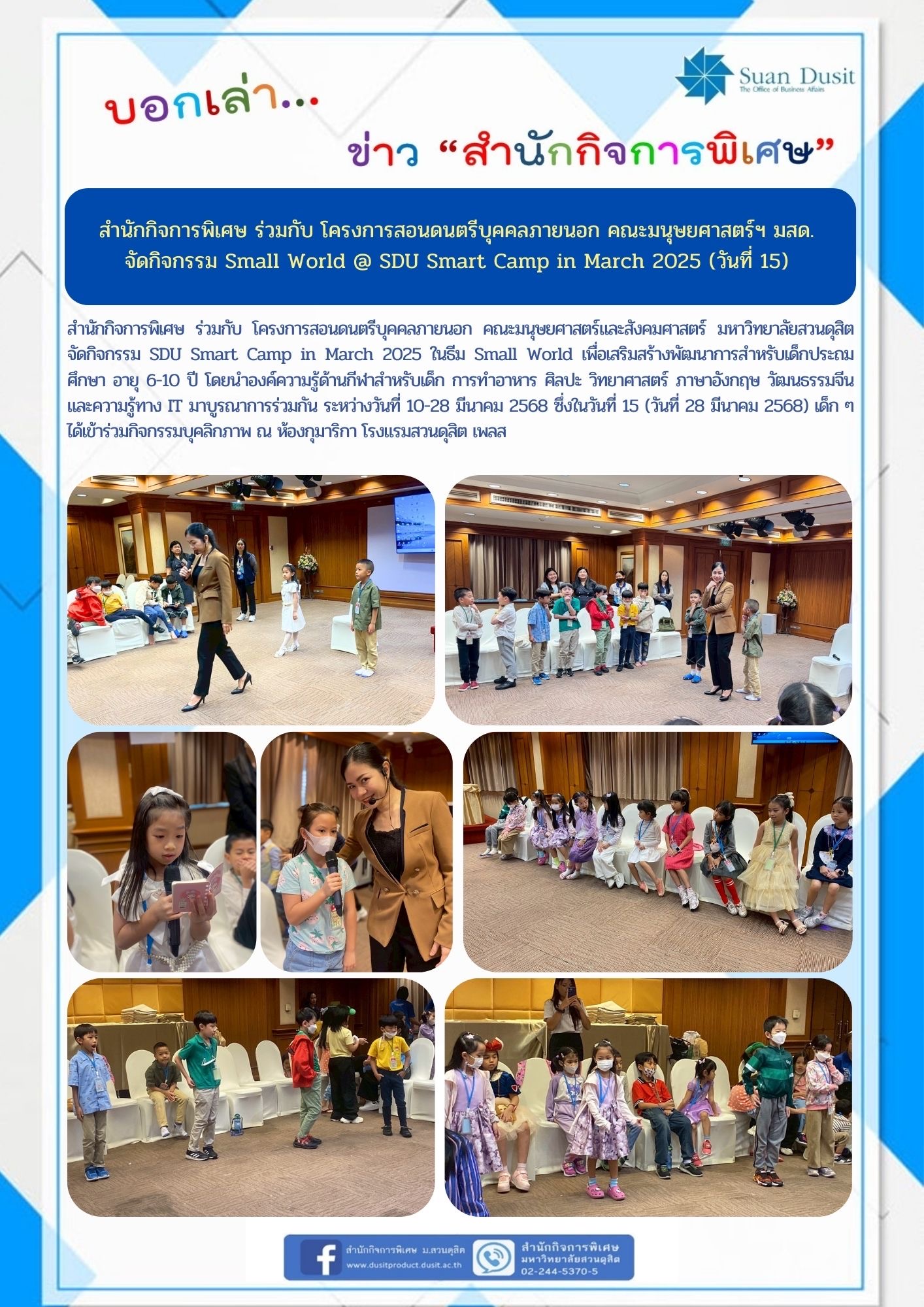 | dc.description.abstract | สำนักกิจการพิเศษ ร่วมกับ โครงการสอนดนตรีบุคคลภายนอก คณะมนุษยศาสตร์และสังคมศาสตร์ มหาวิทยาลัยสวนดุสิต จัดกิจกรรม SDU Smart Camp in March 2025 ในธีม Small World เพื่อเสริมสร้างพัฒนาการสำหรับเด็กประถมศึกษา อายุ 6-10 ปี โดยนำองค์ความรู้ด้านกีฬาสำหรับเด็ก การทำอาหาร ศิลปะ วิทยาศาสตร์ ภาษาอังกฤษ วัฒนธรรมจีน และความรู้ทาง IT มาบูรณาการร่วมกัน ระหว่างวันที่ 10-28 มีนาคม 2568 ซึ่งในวันที่ 15 (วันที่ 28 มีนาคม 2568) | |