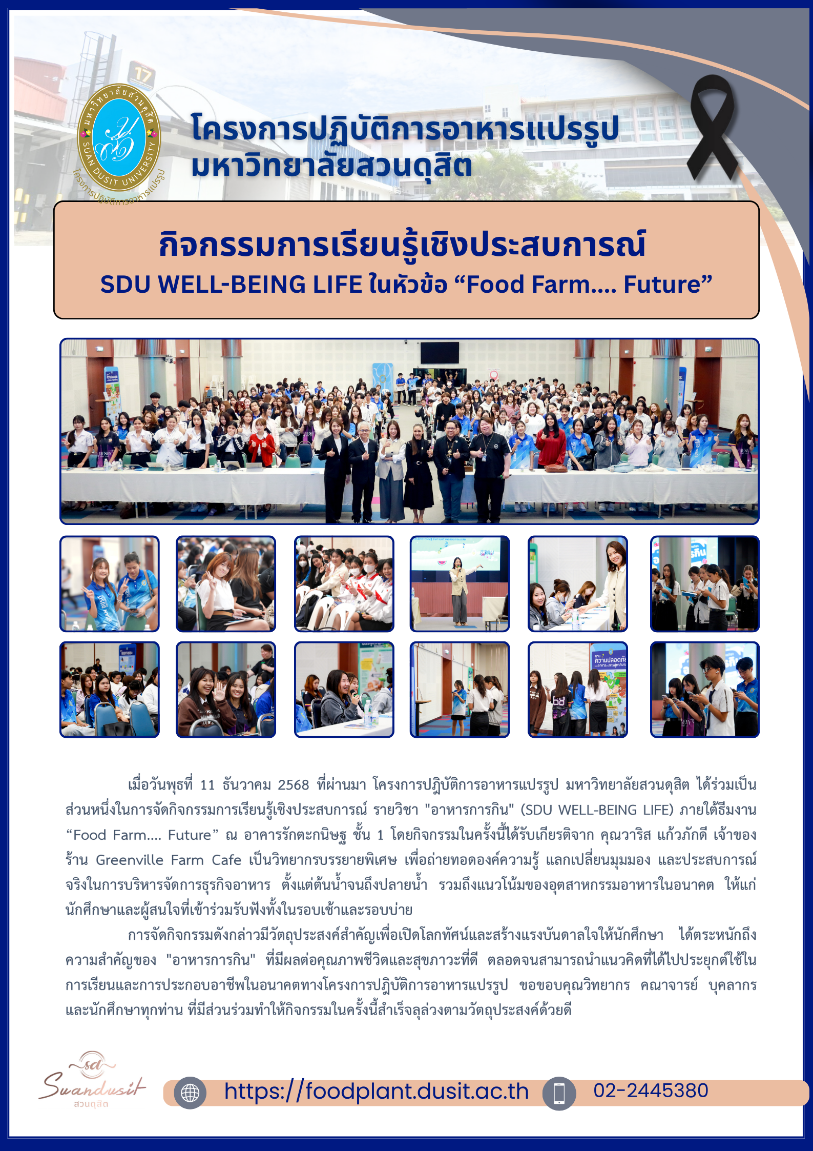 กิจกรรมการเรียนรู้เชิงประสบการณ์รายวิชา “อาหารการกิน” SDU WELL-BEING LIFE ในหัวข้อ “Food Farm…. Future”