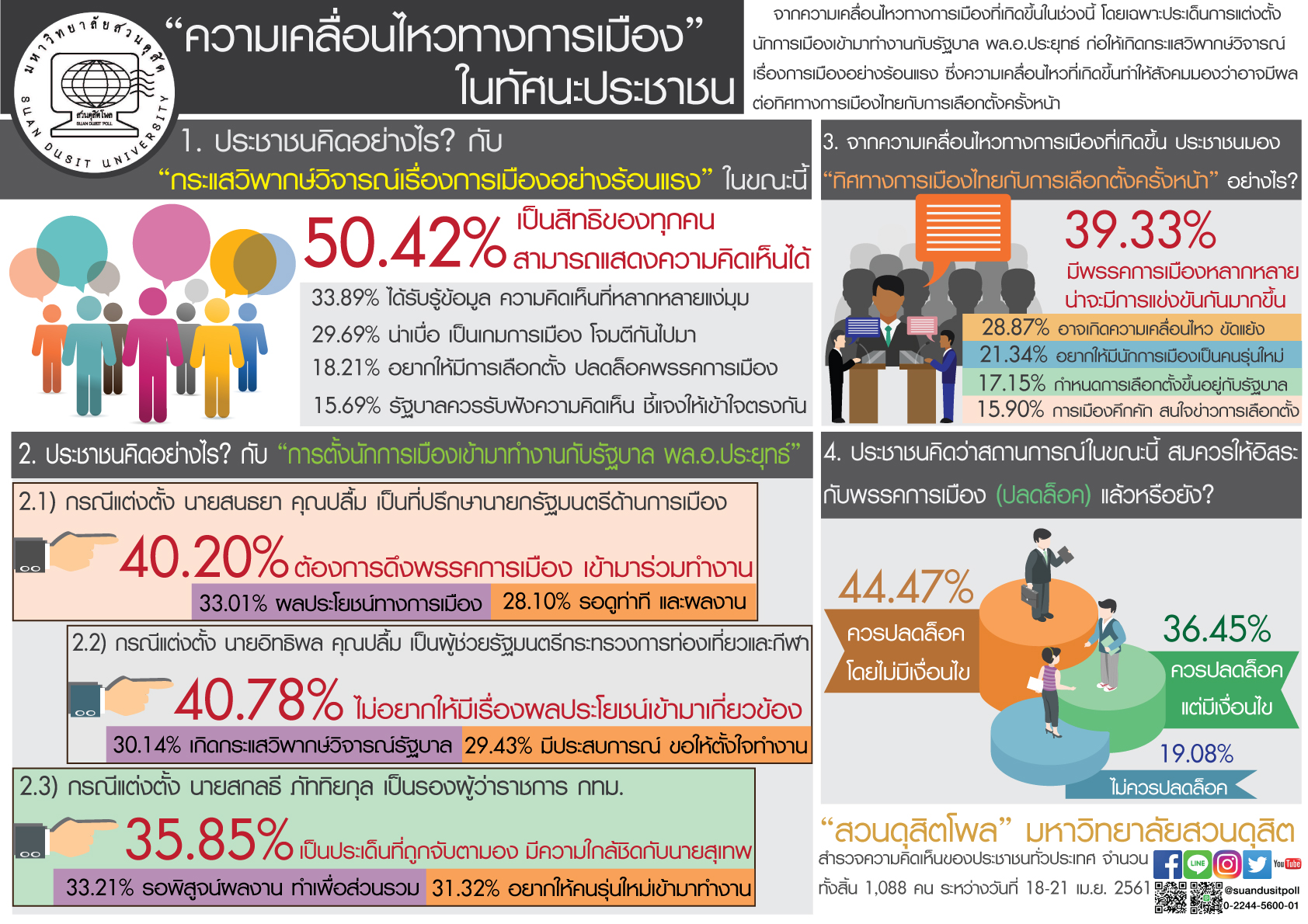 ผลการสำรวจความคิดเห็นของประชาชนต่อความเคลื่อนไหวทางการเมืองในช่วงเดือนเมษายน 2561 โดย "สวนดุสิตโพล" มหาวิทยาลัยสวนดุสิต จากกลุ่มตัวอย่างทั่วประเทศจำนวน 1,088 คน ระหว่างวันที่ 18-21 เมษายน 2561 ครอบคลุม 4 ประเด็นหลัก ได้แก่ (1) ความคิดเห็นต่อกระแสวิพากษ์วิจารณ์เรื่องการเมือง ซึ่งประชาชนส่วนใหญ่มองว่าเป็นสิทธิของทุกคนที่สามารถแสดงความคิดเห็นได้ (2) ความคิดเห็นต่อการแต่งตั้งนักการเมืองเข้ามาทำงานกับรัฐบาล พล.อ.ประยุทธ์ ใน 3 กรณี ได้แก่ นายสนธยา คุณปลื้ม นายอิทธิพล คุณปลื้ม และนายสกลธี ภัททิยกุล โดยประชาชนมองว่าเป็นการสร้างแนวร่วมทางการเมืองและเป็นเรื่องของผลประโยชน์ (3) ทิศทางการเมืองไทยกับการเลือกตั้งครั้งหน้า ประชาชนมองว่าจะมีพรรคการเมืองหลากหลายและมีการแข่งขันกันมากขึ้น และ (4) ความเห็นต่อการปลดล็อคพรรคการเมือง พบว่าร้อยละ 44.47 เห็นควรปลดล็อคโดยไม่มีเงื่อนไข ร้อยละ 36.45 เห็นควรปลดล็อคแต่มีเงื่อนไข และร้อยละ 19.08 ไม่เห็นด้วยกับการปลดล็อค