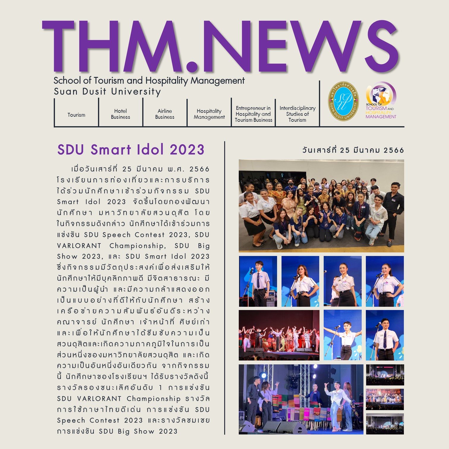 เมื่อวันเสาร์ที่ 25 มีนาคม พ.ศ. 2566 โรงเรียนการท่องเที่ยวและการบริการได้ร่วมนักศึกษาเข้าร่วมกิจกรรม SDU Smart Idol 2023 จัดขึ้นโดยกองพัฒนานักศึกษา มหาวิทยาลัยสวนดุสิต โดยในกิจกรรมดังกล่าว นักศึกษาได้เข้าร่วมการแข่งขัน SDU Speech Contest 2023, SDU VARLORANT Championship, SDU Big Show 2023, และ SDU Smart Idol 2023 ซึ่งกิจกรรมมีวัตถุประสงค์เพื่อส่งเสริมให้นักศึกษาให้มีบุคลิกภาพดี มีจิตสาธารณะ มีความเป็นผู้นำ และมีความกล้าแสดงออก เป็นแบบอย่างที่ดีให้กับนักศึกษา สร้างเครือข่ายความสัมพันธ์อันดีระหว่างคณาจารย์ นักศึกษา เจ้าหน้าที่ ศิษย์เก่า และเพื่อให้นักศึกษาได้ซึมซับความเป็นสวนดุสิตและเกิดความภาคภูมิใจในการเป็นส่วนหนึ่งของมหาวิทยาลัยสวนดุสิต และเกิดความเป็นอันหนึ่งอันเดียวกัน จากกิจกรรมนี้ นักศึกษาของโรงเรียนฯ ได้รับรางวัลดังนี้