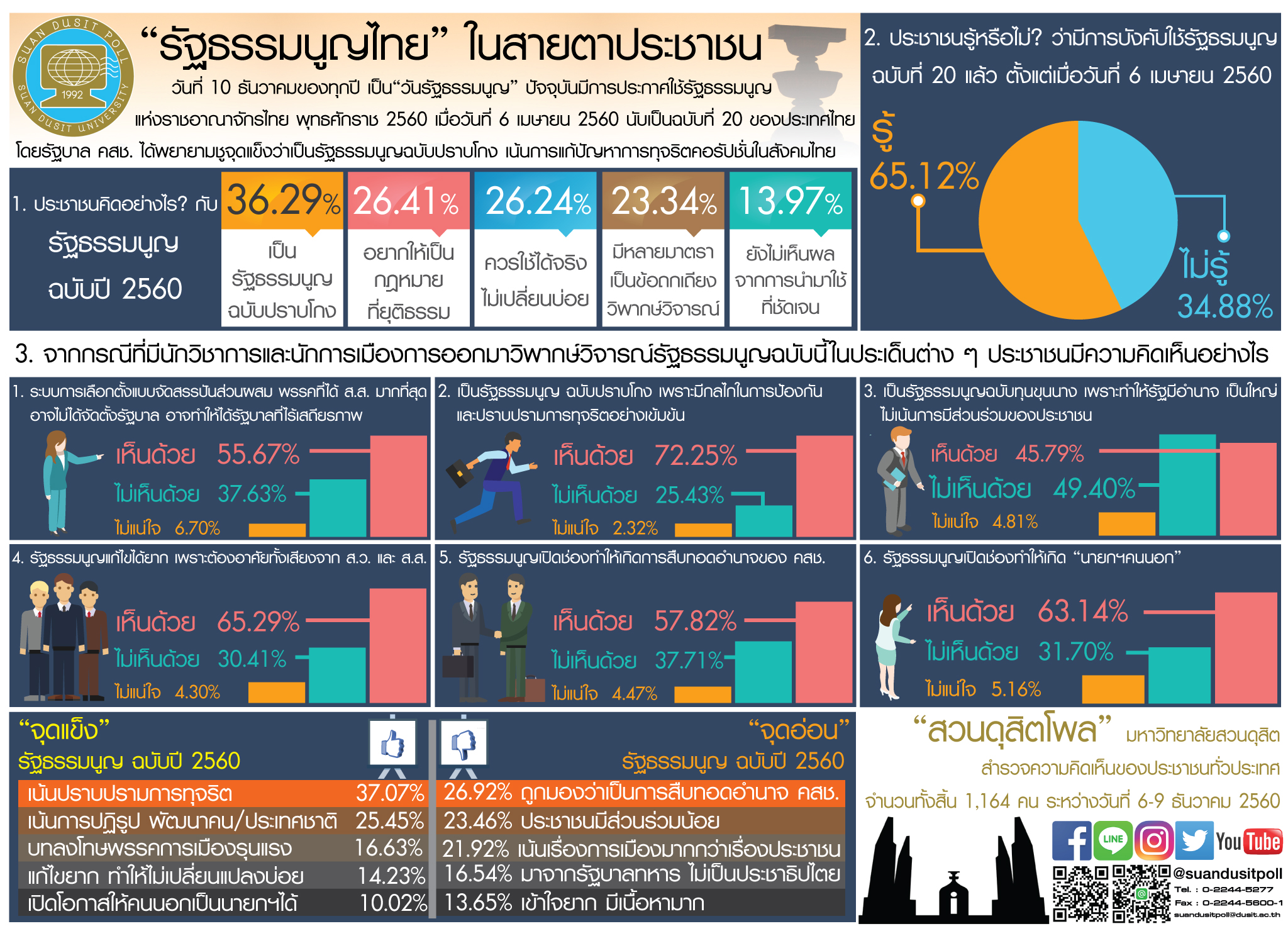 การสำรวจความคิดเห็นของประชาชนต่อรัฐธรรมนูญแห่งราชอาณาจักรไทย พุทธศักราช 2560 โดยมหาวิทยาลัยสวนดุสิต ระหว่างวันที่ 6-9 ธันวาคม 2560 จำนวน 1,164 คน พบว่า ประชาชนส่วนใหญ่มองรัฐธรรมนูญฉบับที่ 20 นี้เป็นฉบับปราบโกงที่เน้นป้องกันการทุจริตคอรัปชั่น (36.29%) ประชาชน 65.12% รู้ว่ามีการใช้รัฐธรรมนูญฉบับใหม่แล้วตั้งแต่ 6 เมษายน 2560 เมื่อพิจารณาประเด็นวิพากษ์วิจารณ์ พบว่าประชาชนเห็นด้วยกับการที่เป็นรัฐธรรมนูญฉบับปราบโกงมากที่สุด (72.25%) แต่กังวลเรื่องระบบเลือกตั้งแบบจัดสรรปันส่วนผสมที่อาจทำให้เกิดรัฐบาลไร้เสถียรภาพ (55.67%) จุดแข็งคือเน้นปราบปรามทุจริต (37.07%) และปฏิรูปพัฒนาประเทศ (25.45%) ขณะที่จุดอ่อนคือถูกมองว่าเป็นการสืบทอดอำนาจ คสช. (26.92%) และประชาชนมีส่วนร่วมน้อย (23.46%)