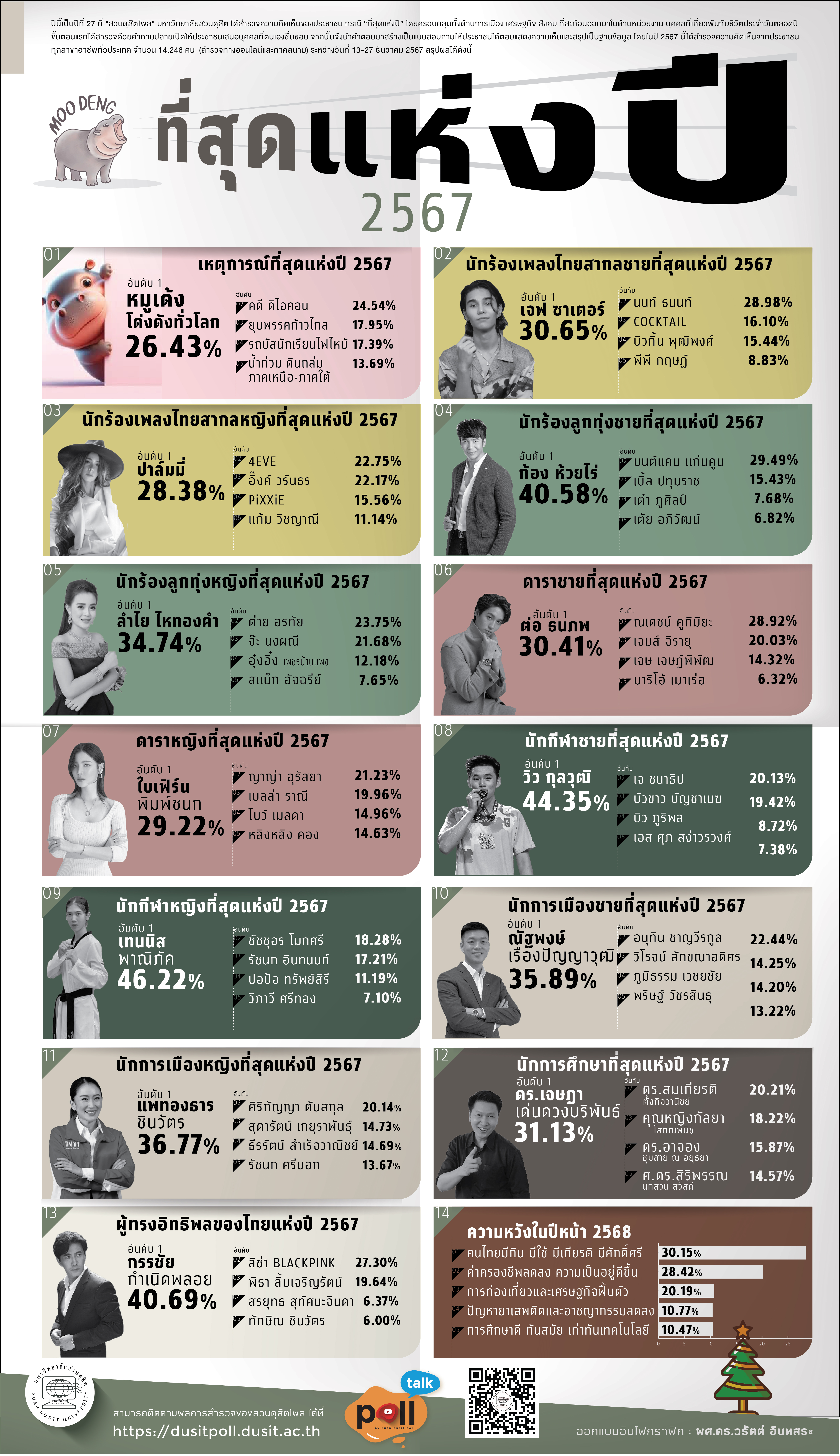 นางสาวพรพรรณ บัวทอง ประธานสวนดุสิตโพล ระบุว่า ผลสำรวจที่สุดแห่งปี “น้องหมูเด้ง” เป็นปรากฏการณ์ที่ครองใจทั้งไทยและต่างชาติ สะท้อนความนิยมที่ตอบโจทย์ความเครียดสะสมจากข่าวหนักหน่วงตลอดปี เช่น การยุบพรรคก้าวไกลและคดีดิไอคอน คนไทยจึงหันมาหาความสุขจากบันเทิง ตั้งแต่น้องหมูเด้ง ละคร ซีรีส์ เพลง ไปจนถึงการเชียร์กีฬา ขณะเดียวกันบุคคลผู้ทรงอิทธิพลแห่งปีอย่างกรรชัย กำเนิดพลอย สะท้อนพลังของคนในวงการสื่อที่สร้างแรงกระเพื่อมในสังคม โดยความหวังปีหน้าคนไทยยังคงมองไปที่การแก้ปัญหาเศรษฐกิจของรัฐบาลเป็นสำคัญ