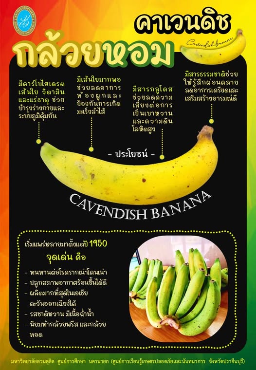 | dc.description | กล้วยหอมคาเวนดิช (CARVENDISH BANANA) เริ่มแพร่หลายมาตั้งแต่ปี 1950 จุดเด่น คือ - ทนทานต่อโรครากเน่าโคนเน่า - ปลูกสภาพอากาศร้อนชื้นได้ดี - ผลิตมากที่สุดในเอเชียตะวันออกเฉียงใต้ - รสชาติหวาน มีเนื้อฉ่ำน้ำ - นิยมทำกล้วยฟรีซ และกล้วยทอด - เปลือกกล้วย สามารถนำมาหมักปุ๋ย กินผลสุก มีประโยชน์หลากหลาย - มีคาร์โบไฮเดรต เส้นใย วิตามิน และแร่ธาตุ ช่วยบำรุงร่างกายและระบบภูมิคุ้มกัน - มีเส้นใยมากพอช่วยลดอาการท้องผูกและป้องกันการเกิดมะเร็งลำไส้ - มีสารกลูโคส ช่วยลดความเสี่ยงต่อการเป็นเบาหวานและความดันโลหิตสูง - มีสารธรรมชาติช่วยให้รู้สึกผ่อนคลาย ลดอาการเครียดและเสริมสร้างอารมณ์ดี | |