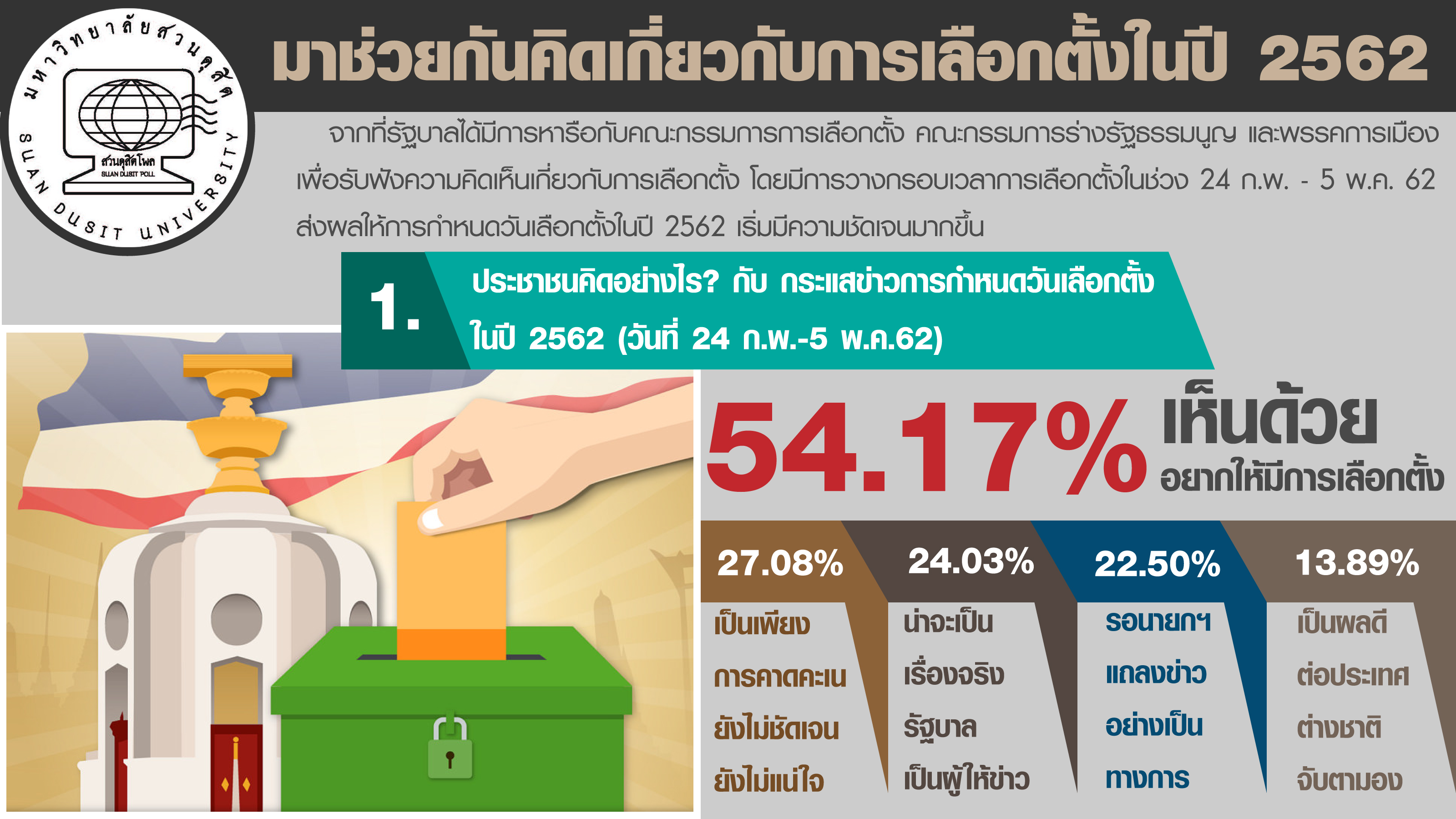 การสำรวจความคิดเห็นของประชาชนจำนวน 1,136 คน ระหว่างวันที่ 26–30 มิถุนายน 2561 มีวัตถุประสงค์เพื่อติดตามทัศนคติต่อกระแสข่าวการกำหนดวันเลือกตั้งในปี 2562 ซึ่งอยู่ในช่วงกรอบ 24 กุมภาพันธ์ ถึง 5 พฤษภาคม 2562 ผลการสำรวจพบว่า ประชาชนส่วนใหญ่ (54.17%) เห็นว่าข่าวดังกล่าวเป็นเรื่องดีและต้องการให้เกิดการเลือกตั้งโดยเร็ว อย่างไรก็ตาม ยังมีประชาชนจำนวนไม่น้อยที่ไม่ค่อยเชื่อมั่นหรือไม่เชื่อเลยว่าจะมีการเลือกตั้งตามกำหนด