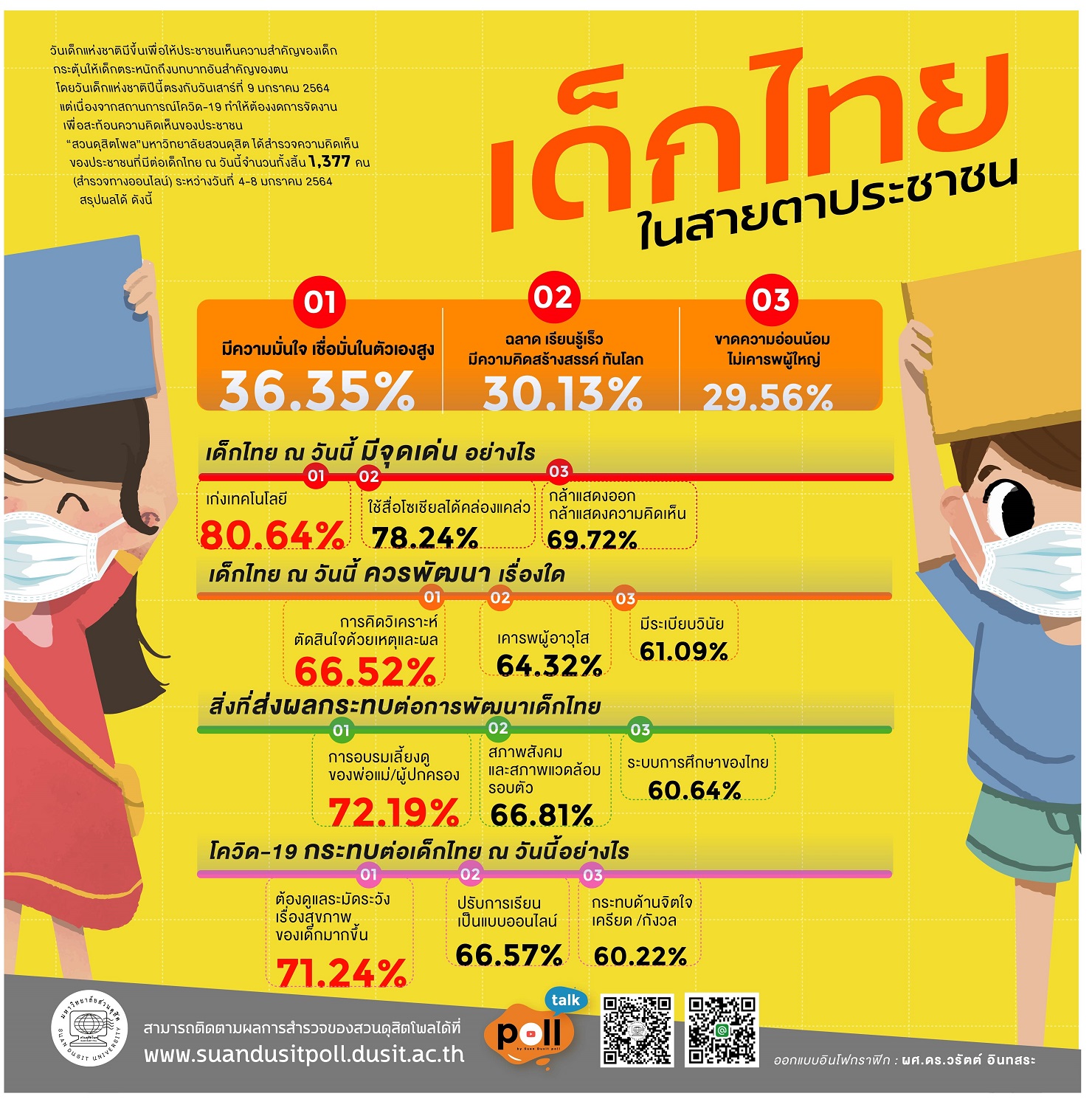 สวนดุสิตโพล มหาวิทยาลัยสวนดุสิต ได้จัดทำการสำรวจความคิดเห็นของประชาชนจำนวน 1,377 คน ระหว่างวันที่ 4-8 มกราคม 2564 เกี่ยวกับมุมมองต่อเด็กไทยในยุคปัจจุบัน โดยพบว่าประชาชนมองว่าเด็กไทยมีความมั่นใจในตนเองสูง ฉลาด ทันสมัย และมีทักษะด้านเทคโนโลยีและภาษา ซึ่งเป็นคุณลักษณะที่สอดคล้องกับทักษะในศตวรรษที่ 21 จุดเด่นของเด็กไทย ได้แก่ ความสามารถด้านเทคโนโลยี การใช้สื่อโซเชียล และการกล้าแสดงออก อย่างไรก็ตาม ยังมีข้อเสนอแนะให้เด็กไทยพัฒนาทักษะด้านการคิดวิเคราะห์ การเคารพผู้อื่น และการเข้าสังคมมากขึ้น ปัจจัยสำคัญที่มีผลต่อพัฒนาการของเด็ก ได้แก่ การเลี้ยงดูของผู้ปกครอง สภาพแวดล้อม และระบบการศึกษา ทั้งนี้ สถานการณ์โควิด-19 ยังส่งผลกระทบต่อชีวิตเด็กในด้านสุขภาพ จิตใจ และรูปแบบการเรียนรู้ ส่งผลให้จำเป็นต้องมีความร่วมมือจากทุกภาคส่วนในการสนับสนุนและพัฒนาเด็กไทยอย่างต่อเนื่อง เพื่อเตรียมความพร้อมสำหรับอนาคตที่ท้าทาย