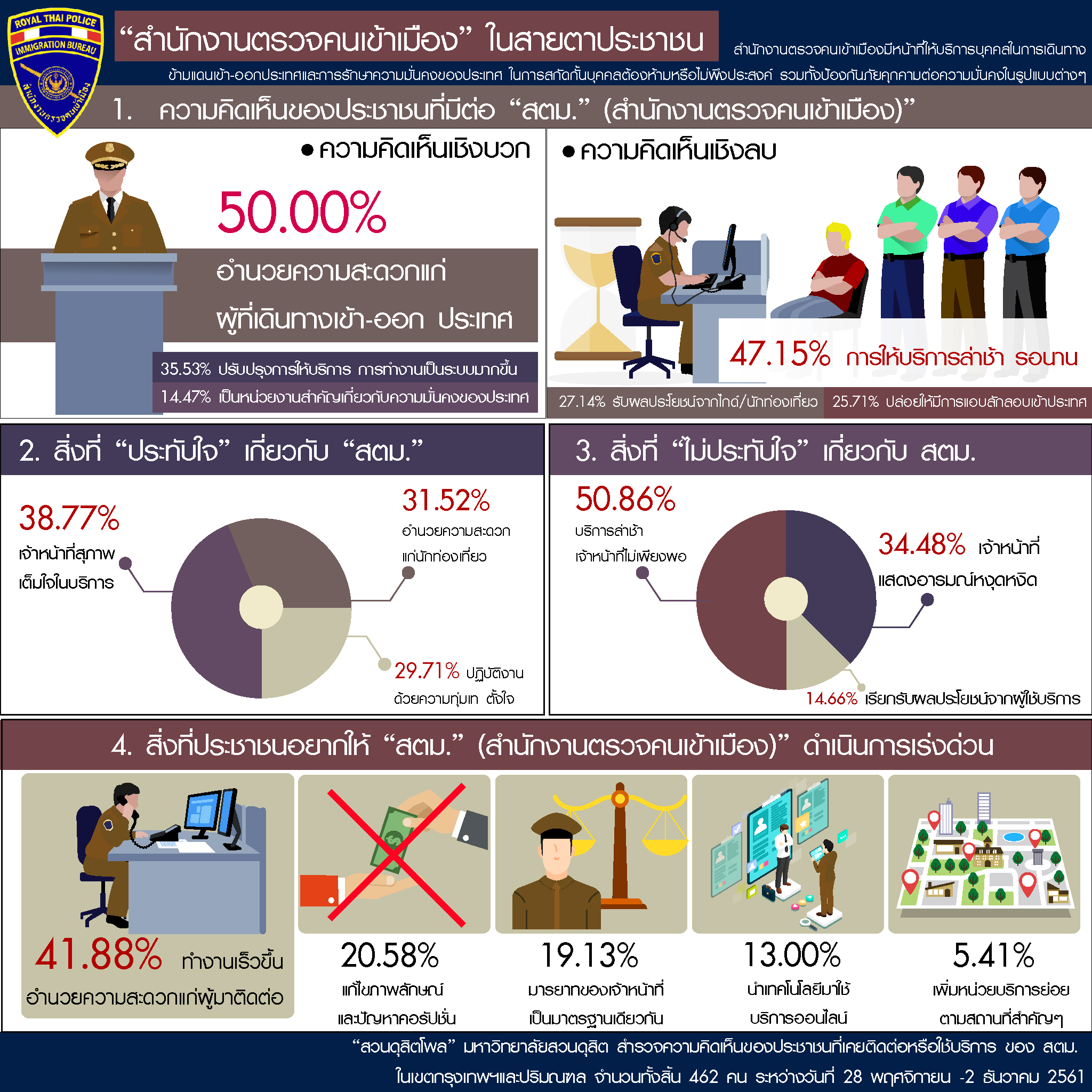สำนักงานตรวจคนเข้าเมือง (สตม.) มีบทบาทสำคัญในการดูแลการเดินทางเข้า-ออกประเทศและรักษาความมั่นคงของชาติ “สวนดุสิตโพล” ได้ทำการสำรวจความคิดเห็นประชาชนจำนวน 462 คน ในเขตกรุงเทพฯและปริมณฑล ระหว่างวันที่ 28 พฤศจิกายน – 2 ธันวาคม 2561 เพื่อประเมินความพึงพอใจและข้อเสนอแนะที่มีต่อการทำงานของ สตม. ผลสำรวจพบว่า ความคิดเห็นเชิงบวกของประชาชน ได้แก่ การให้บริการด้านการเดินทางที่สะดวก (50.00%) และการปรับปรุงบริการที่มีระบบมากขึ้น ขณะที่ความเห็นเชิงลบส่วนใหญ่มุ่งที่ความล่าช้าในการให้บริการ (47.15%) และกรณีการเรียกรับผลประโยชน์จากเจ้าหน้าที่ (27.14%) ด้านความประทับใจ ประชาชนชื่นชมเจ้าหน้าที่ที่ให้บริการด้วยความสุภาพและตั้งใจ ส่วนข้อเสนอเพื่อการพัฒนา ได้แก่ การเร่งความเร็วในการให้บริการ (41.88%) การแก้ภาพลักษณ์เกี่ยวกับคอร์รัปชัน และการพัฒนาเทคโนโลยีเพื่อลดขั้นตอน เพิ่มความสะดวกสบายให้แก่ผู้ใช้บริการ