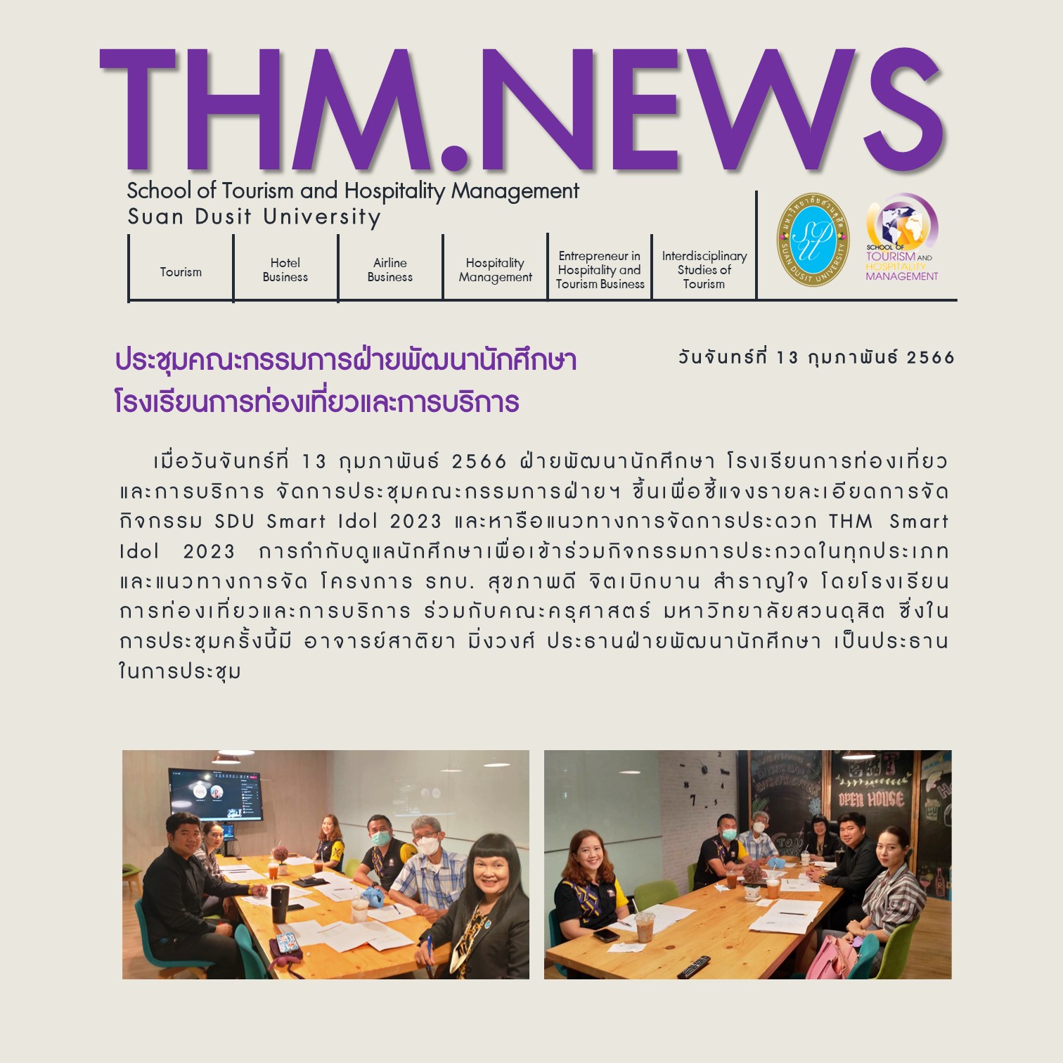 เมื่อวันจันทร์ที่ 13 กุมภาพันธ์ 2566 ฝ่ายพัฒนานักศึกษา โรงเรียนการท่องเที่ยวและการบริการ จัดการประชุมคณะกรรมการฝ่ายฯ ขึ้นเพื่อชี้แจงรายละเอียดการจัดกิจกรรม SDU Smart Idol 2023 และหารือแนวทางการจัดการประดวก THM0Smart Idol 2023 การกำกับดูแลนักศึกษาเพื่อเข้าร่วมกิจกรรมการประกวดในทุกประเภท และแนวทางการจัด โครงการ รทบ. สุขภาพดี จิตเบิกบาน สำราญใจ โดยโรงเรียน การท่องเที่ยวและการบริการ ร่วมกับคณะครุศาสตร์ มหาวิทยาลัยสวนดุสิต ซึ่งใน การประชุมครั้งนี้มี อาจารย์สาติยา มิ่งวงศ์ ประธานฝ่ายพัฒนานักศึกษา เป็นประธานในการประชุม