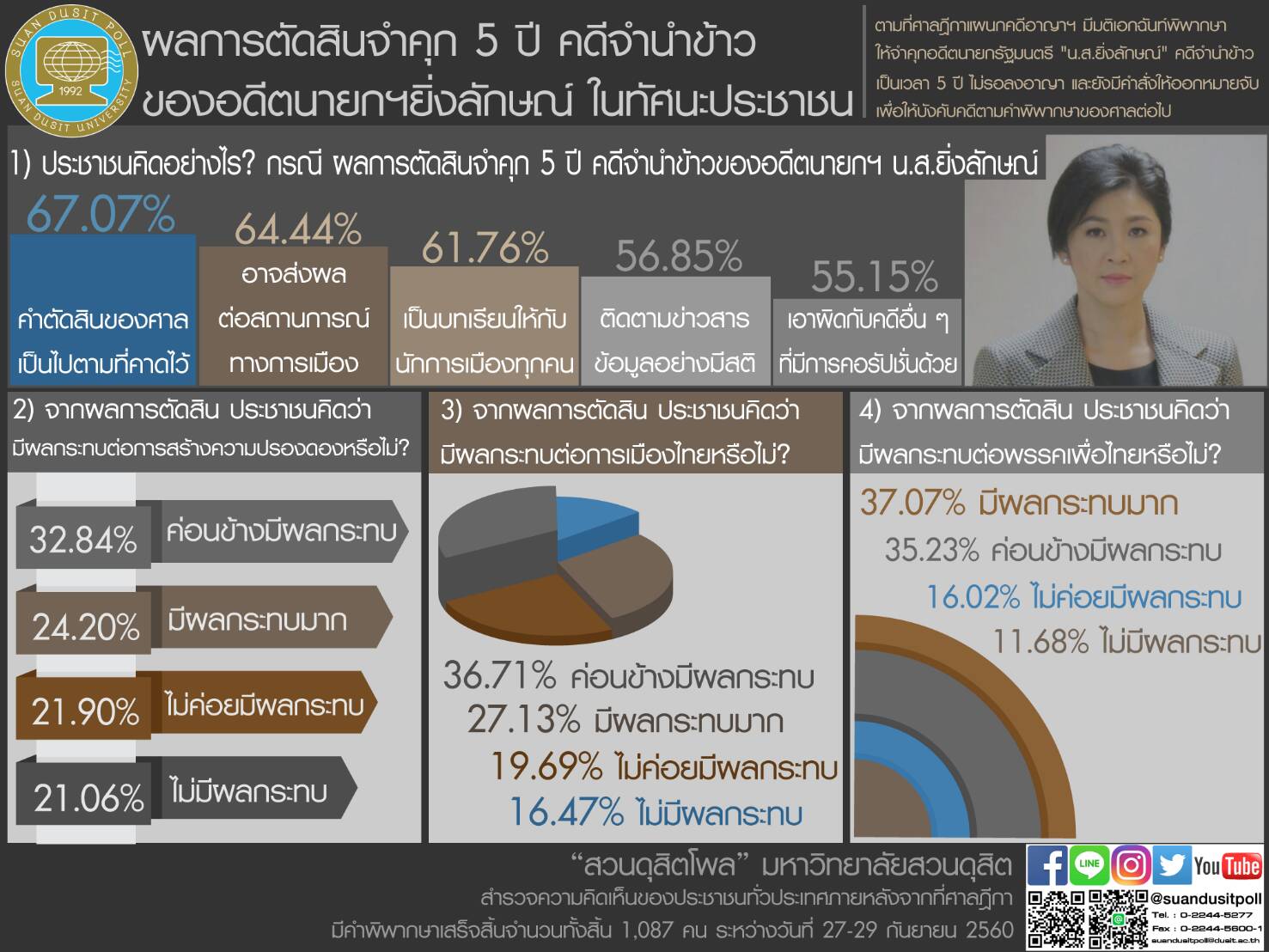 จากการสำรวจความคิดเห็นของประชาชนทั่วประเทศโดยมหาวิทยาลัยสวนดุสิต ระหว่างวันที่ 27–29 กันยายน 2560 เกี่ยวกับผลการตัดสินจำคุก 5 ปี คดีจำนำข้าวของอดีตนายกรัฐมนตรี น.ส.ยิ่งลักษณ์ ชินวัตร พบว่า 67.07% เห็นว่าคำตัดสินของศาลเป็นไปตามที่คาดไว้ ขณะที่ 64.44% เห็นว่าผลตัดสินส่งผลต่อสถานการณ์ทางการเมือง และ 61.76% มองว่าเป็นบทเรียนให้กับนักการเมืองทุกคน ประชาชนส่วนหนึ่งยังเห็นว่าการพิจารณาควรมีการปรับปรุงให้ครอบคลุมด้านอื่น ๆ ด้วย ในด้านผลกระทบต่อความปรองดองของสังคม 32.84% มองว่าค่อนข้างมีผลกระทบ ขณะที่ 24.20% เห็นว่ามีผลกระทบมาก ส่วนผลกระทบต่อการเมืองไทย 36.71% ระบุว่าค่อนข้างมีผลกระทบ และ 27.13% มองว่ามีผลกระทบมาก สำหรับผลกระทบต่อพรรคเพื่อไทย 37.07% เชื่อว่ามีผลกระทบมาก และอีก 35.23% ระบุว่าค่อนข้างมีผลกระทบ สะท้อนให้เห็นว่าคดีนี้มีนัยสำคัญทั้งด้านการเมืองและความเชื่อมั่นของประชาชน