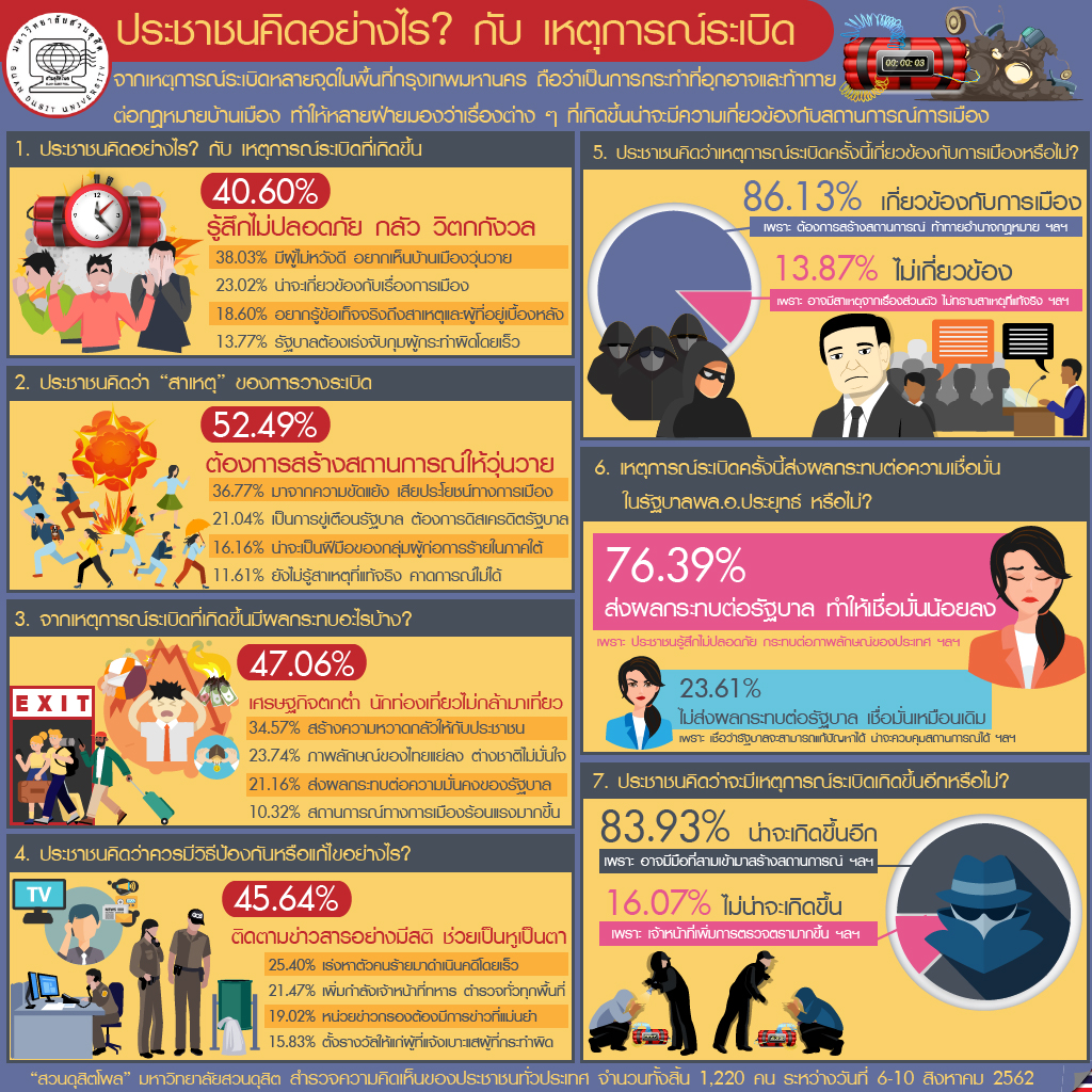 จากเหตุการณ์ระเบิดหลายจุดในกรุงเทพมหานครซึ่งสร้างความหวาดกลัวและความไม่มั่นคงในสังคม การสำรวจความคิดเห็นของประชาชนจำนวน 1,220 คน ระหว่างวันที่ 6–10 สิงหาคม 2562 พบว่า ร้อยละ 40.60 ของประชาชนรู้สึกไม่ปลอดภัยและวิตกกังวล โดยมองว่าสาเหตุหลักคือความต้องการสร้างความปั่นป่วน (52.49%) และความขัดแย้งทางการเมือง (36.77%) เหตุการณ์นี้ส่งผลกระทบทางเศรษฐกิจอย่างเห็นได้ชัด โดยเฉพาะการท่องเที่ยวและความเชื่อมั่นของนักลงทุน (47.06%) ประชาชนเสนอให้มีมาตรการรับมือ เช่น การเฝ้าระวังของประชาชนร่วมกับเจ้าหน้าที่ (45.64%) และเร่งจับกุมผู้กระทำผิด ร้อยละ 86.13 เชื่อว่าเหตุการณ์เกี่ยวข้องกับการเมือง และ 76.39% เห็นว่าทำให้ความเชื่อมั่นต่อรัฐบาลลดลง นอกจากนี้ ร้อยละ 83.93 เชื่อว่าจะมีเหตุการณ์ในลักษณะเดียวกันเกิดขึ้นอีกในอนาคตหากไม่มีมาตรการป้องกันอย่างจริงจังและต่อเนื่อง