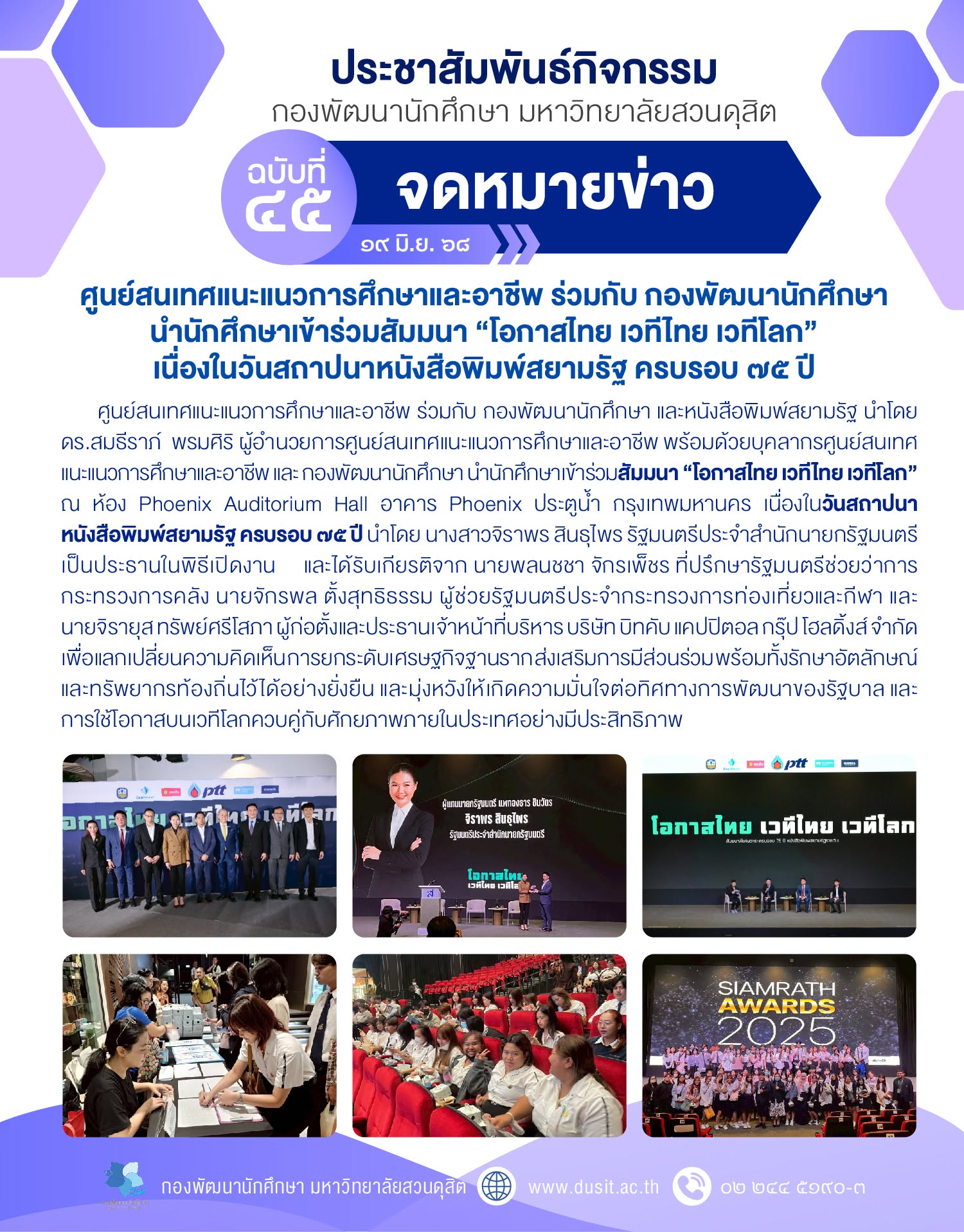 ศูนย์สนเทศแนะแนวการศึกษาและอาชีพ ร่วมกับ กองพัฒนานักศึกษา และหนังสือพิมพ์สยามรัฐ นำโดย ดร.สมรีราก์ พรมศิรี ผู้อำนวยการศูนย์สนเทศแนะแนวการศึกษาและอาชีพ พร้อมด้วยบุคลากรศูนย์สนเทศแนะแนวการศึกษาและอาชีพ และกองพัฒนานักศึกษา เข้าร่วมสัมมนา "โอกาสไทย เวทีไทย เวทีโลก" ณ ห้อง Phoenix Auditorium Hall อาคาs Phoenix ประตูนำ กรุงเทพมหานคร เนื่องในวันสถาปนาหนังสือพิมพ์สยามรัฐ ครบรอบ ๗๕ ปี นำโดย นางสาวจิราพร สินธุไพร รัฐมนตรีประจำสำนักนายกรัฐมนตรี เป็นประธานในพิธีเปิดงาน และได้รับเกียรติจาก นายพลนชชา จักรเพ็ชร ที่ปรึกษารัฐมนตรีช่วยว่าการกระทรวงการคลัง นายจักรพล ตั้งสุทธิธรรม ผู้ช่วยรัฐมนตรีประจำกระทรวงการท่องเที่ยวและกีฬา และนายจิรายุส ทรัพย์ศรีโสภา ผู้ก่อตั้งและประธานเจ้าหน้าที่บริหาร บริษัท บิทคับ แคปปีตอลกรีป โฮลดิ้งส์จำกัด เพื่อแลกเปลี่ยนความคิดเห็นการยกระดับเศรษฐกิจฐานรากส่งเสริมการมีส่วนร่วมพร้อมทั้งรักษาอัตลักษณ์ และทรัพยากรท้องถิ่นไว้ได้อย่างยั่งยืน และมุ่งหวังให้เกิดความมั่นใจต่อทิศทางการพัฒนาของรัฐบาล และ การใช้โอกาสบนเวทีโลกควบคู่กับศักยภาพภายในประเทศอย่างมีประสิทธิภาพ