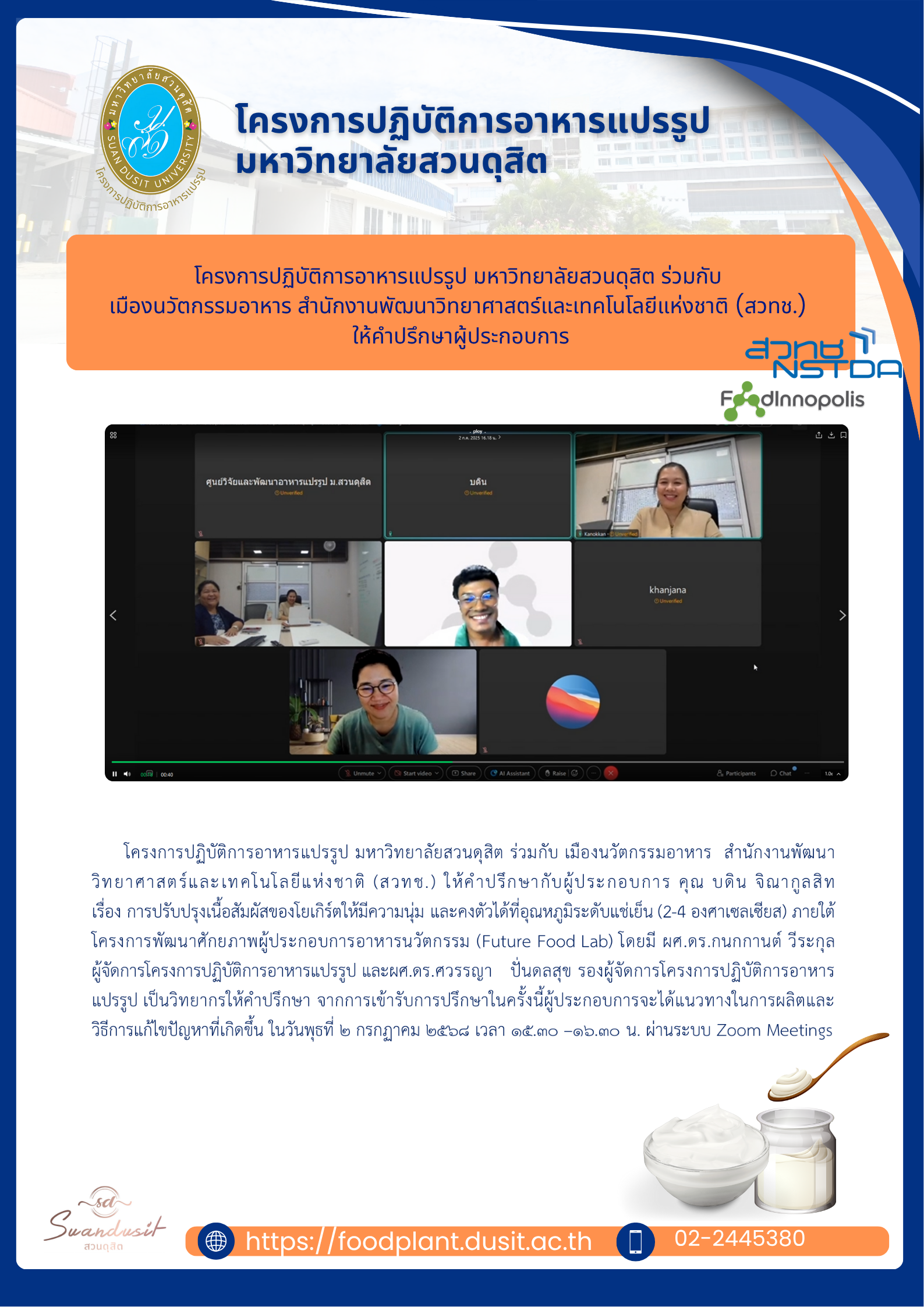 โครงการปฏิบัติการอาหารแปรรูป มหาวิทยาลัยสวนดุสิต ร่วมกับ เมืองนวัตกรรมอาหาร สำนักงานพัฒนาวิทยาศาสตร์และเทคโนโลยีแห่งชาติ (สวทช.) ให้คำปรึกษากับผู้ประกอบการ