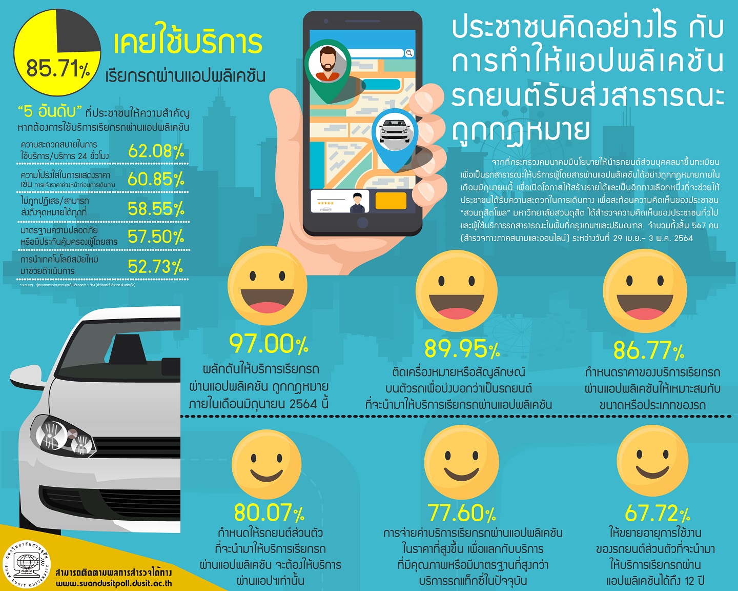 สวนดุสิตโพล มหาวิทยาลัยสวนดุสิต ได้สำรวจความคิดเห็นของประชาชนจำนวน 567 คน ในพื้นที่กรุงเทพฯและปริมณฑล ระหว่างวันที่ 29 เมษายน – 3 พฤษภาคม 2564 เกี่ยวกับนโยบายของกระทรวงคมนาคมในการผลักดันให้บริการรถยนต์รับส่งสาธารณะผ่านแอปพลิเคชันถูกกฎหมาย พบว่าประชาชนส่วนใหญ่ (97.00%) เห็นด้วยกับนโยบายดังกล่าว เนื่องจากมองว่าเป็นทางเลือกที่สะดวก ปลอดภัย และสอดคล้องกับวิถีชีวิตในยุคดิจิทัล ปัจจัยสำคัญที่ส่งผลต่อการตัดสินใจใช้บริการ ได้แก่ ความสะดวกในการเข้าถึง บริการ 24 ชั่วโมง ความโปร่งใสด้านราคา และความปลอดภัยในการเดินทาง นอกจากนี้ ประชาชนยังสนับสนุนให้มีการติดสัญลักษณ์เฉพาะรถที่เข้าร่วมบริการ การกำหนดราคาตามประเภทรถ และยินดีจ่ายเพิ่มเพื่อคุณภาพที่ดีกว่าแท็กซี่ทั่วไป ผลสำรวจสะท้อนถึงแนวโน้มการเปลี่ยนผ่านของระบบขนส่งในไทยที่เข้าสู่ยุคดิจิทัลอย่างจริงจัง และเปิดโอกาสให้เกิดการแข่งขันอย่างเป็นธรรมระหว่างระบบเดิมและระบบใหม่ เพื่อประโยชน์สูงสุดของผู้บริโภค
