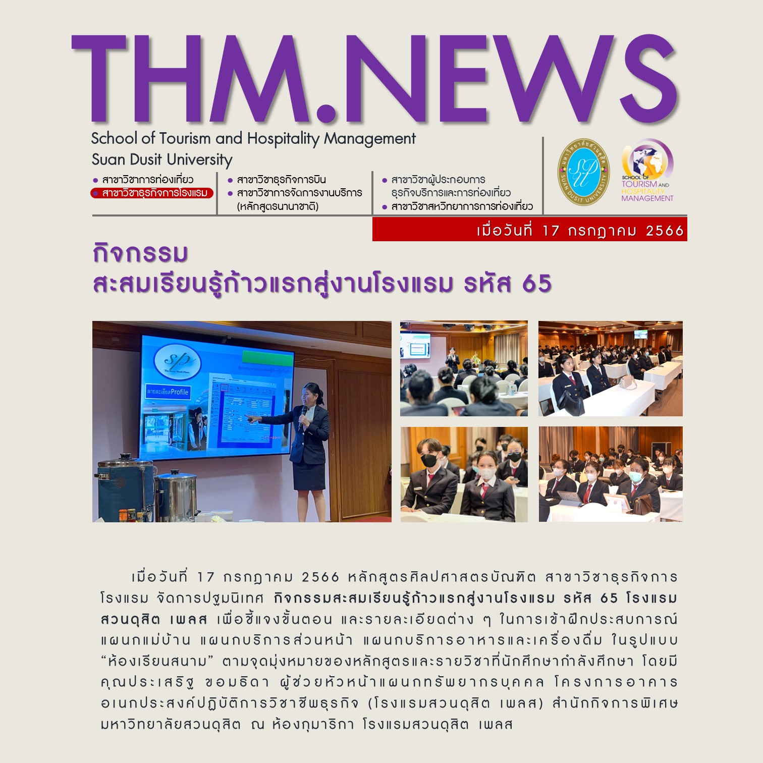 เมื่อวันที่ 17 กรกฏาคม 2566 หลักสูตรศิลปศาสตรบัณฑิต สาขาธุรกิจการโรงแรม จัดปฐมนิเทศ กิจกรรมสะสมเรียนรู้ก้าวแรกสู่งานโรงแรม รหัส 65 โรงแรมสวนดสิต เพลส เพื่อชี้แจงขั้นตอน และรายละเอียดต่างๆ ในการเข้าฝึกประสบการณ์แผนกแม่บ้าน แผนกบริการส่วนหน้า แผนกบริการอาหารและเครื่องดื่ม ในรูปแบบ "ห้องเรียนสนาม" ตามจุดมุ่งหมายและหลักสูตรและรายวิชาที่นักศึกษากำลังศึกษา โดยมีคุณประเสริฐ ขอมธิดา ผู้ช่วยแผนกทรัพยากรบุคคล โครงการอาคารอเนกประสงค์ปปฏิบัติการวิชาชีพธุรกิจ (โรงแรมสนดุสิต เพลส) สำนักกิจการพิเศษ มหาวิทยาลัยสวนดุสิต ณ ห้องกุมาริกา โรงแรมสวนดุสิต เพลส