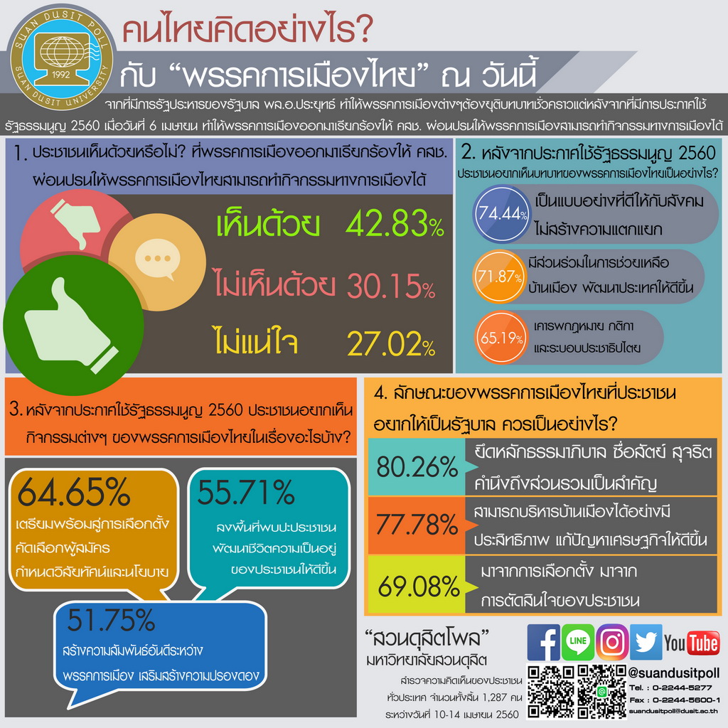 การสำรวจความคิดเห็นของประชาชนจำนวน 1,287 คน ระหว่างวันที่ 10-14 เมษายน 2560 เกี่ยวกับพรรคการเมืองไทยภายหลังการประกาศใช้รัฐธรรมนูญ 2560 และการเรียกร้องให้คณะรักษาความสงบแห่งชาติ (คสช.) ผ่อนปรนให้พรรคการเมืองทำกิจกรรมทางการเมืองได้ พบว่า ประชาชนส่วนใหญ่เห็นด้วยกับการเรียกร้องดังกล่าว (42.83%) เนื่องจากสอดคล้องกับหลักประชาธิปไตย ในขณะที่ 30.15% ไม่เห็นด้วยเพราะกังวลเรื่องความวุ่นวาย สำหรับบทบาทที่ประชาชนต้องการเห็นจากพรรคการเมือง ได้แก่ การเป็นแบบอย่างที่ดีและไม่สร้างความแตกแยก (74.44%) การมีส่วนร่วมพัฒนาประเทศ (71.87%) และการเคารพกฎหมายและระบอบประชาธิปไตย (65.19%) กิจกรรมที่ประชาชนอยากเห็นมากที่สุดคือ การเตรียมพร้อมสู่การเลือกตั้ง (64.65%) ลักษณะของพรรคการเมืองที่ประชาชนต้องการให้เป็นรัฐบาลคือ การยึดหลักธรรมาภิบาล (80.26%) และสามารถบริหารบ้านเมืองได้อย่างมีประสิทธิภาพ (77.78%)