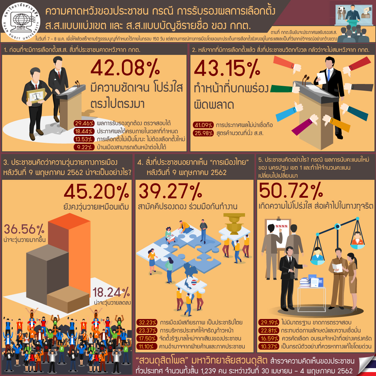 สวนดุสิตโพล มหาวิทยาลัยสวนดุสิต ได้สำรวจความคิดเห็นของประชาชนทั่วประเทศจำนวน 1,239 คน ระหว่างวันที่ 30 เมษายน – 4 พฤษภาคม 2562 เพื่อสะท้อนความคาดหวังต่อการรับรองผลการเลือกตั้ง ส.ส. ของคณะกรรมการการเลือกตั้ง (กกต.) พบว่าประชาชนคาดหวังให้กระบวนการมีความชัดเจน โปร่งใส ตรงไปตรงมา (42.08%) และผลการรับรองเป็นข้อมูลที่ถูกต้อง ตรวจสอบได้ (29.46%) ขณะเดียวกัน ประชาชนวิตกกังวลว่ากกต.จะทำหน้าที่ผิดพลาด ไม่โปร่งใส (43.15%) และการประกาศผลอาจก่อให้เกิดความขัดแย้ง (41.09%) โดย 45.20% เชื่อว่าสถานการณ์ทางการเมืองหลังวันที่ 9 พฤษภาคม 2562 จะยังคงวุ่นวายเหมือนเดิม ส่วนสิ่งที่ประชาชนอยากเห็นหลังการรับรองผลเลือกตั้ง คือ ความสามัคคีปรองดอง (39.27%) การเมืองที่มีเสถียรภาพ (32.23%) และการบริหารประเทศอย่างมีประสิทธิภาพ ขณะกรณีการนับคะแนนใหม่ในนครปฐม เขต 1 ประชาชนร้อยละ 50.72 เห็นว่าไม่โปร่งใสและส่อไปในทางทุจริต ซึ่งกระทบต่อความเชื่อมั่นในองค์กรจัดการเลือกตั้ง